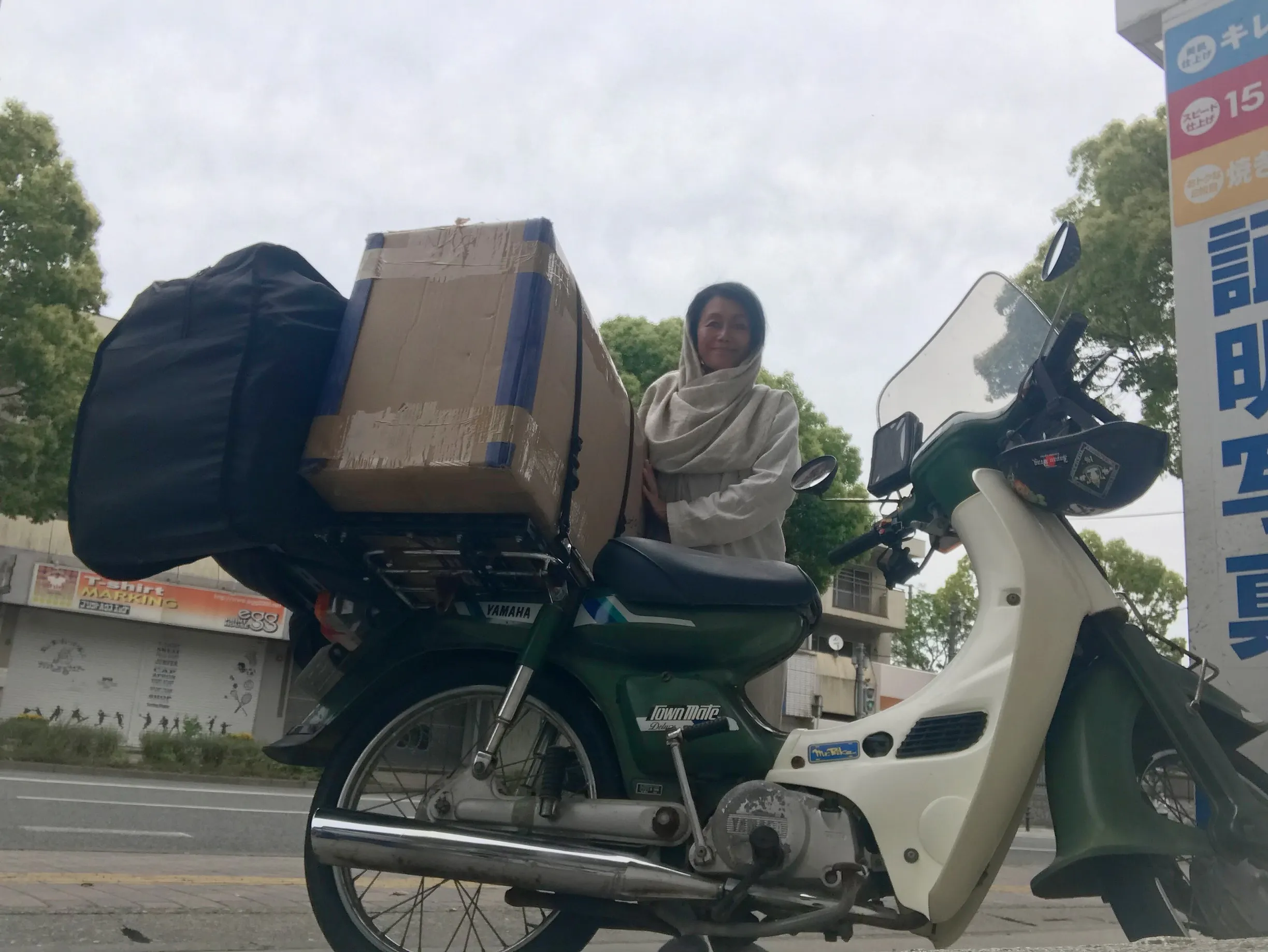大荷物なので、当初はタクシーで郵便局へ行く予定でしたが、荷物を降ろした際に、大きさはあるけど重さは見た目ほどではないことに気づき、試しにバイクに乗せてみると?