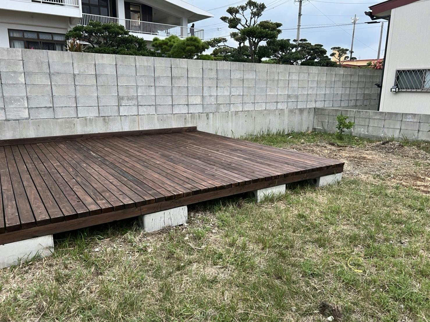 皆さんの応援のおかげで、ウッドデッキの土台部分が完成しました〜!