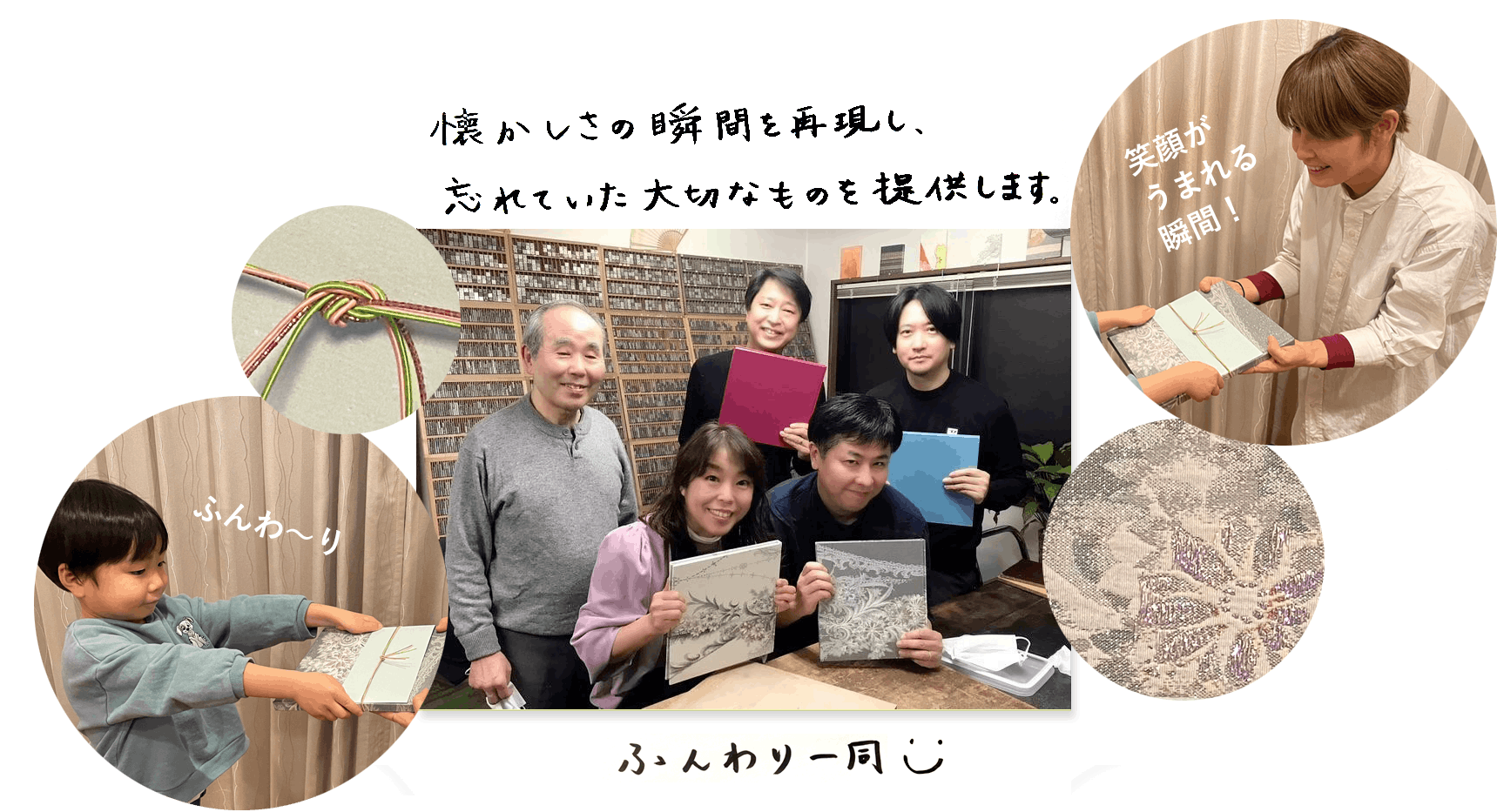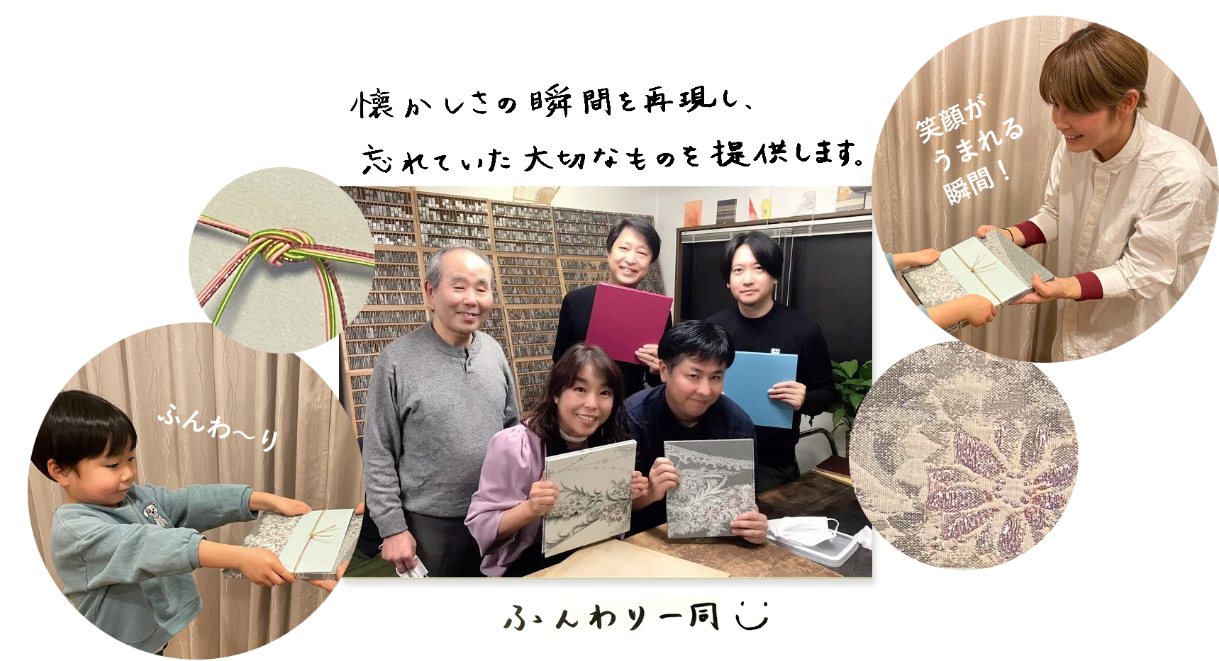 京都で技を磨き続ける松田製本処の職人から技術を伝承し、裏打ちしなめした着物生地を飾り表紙として採用しました。