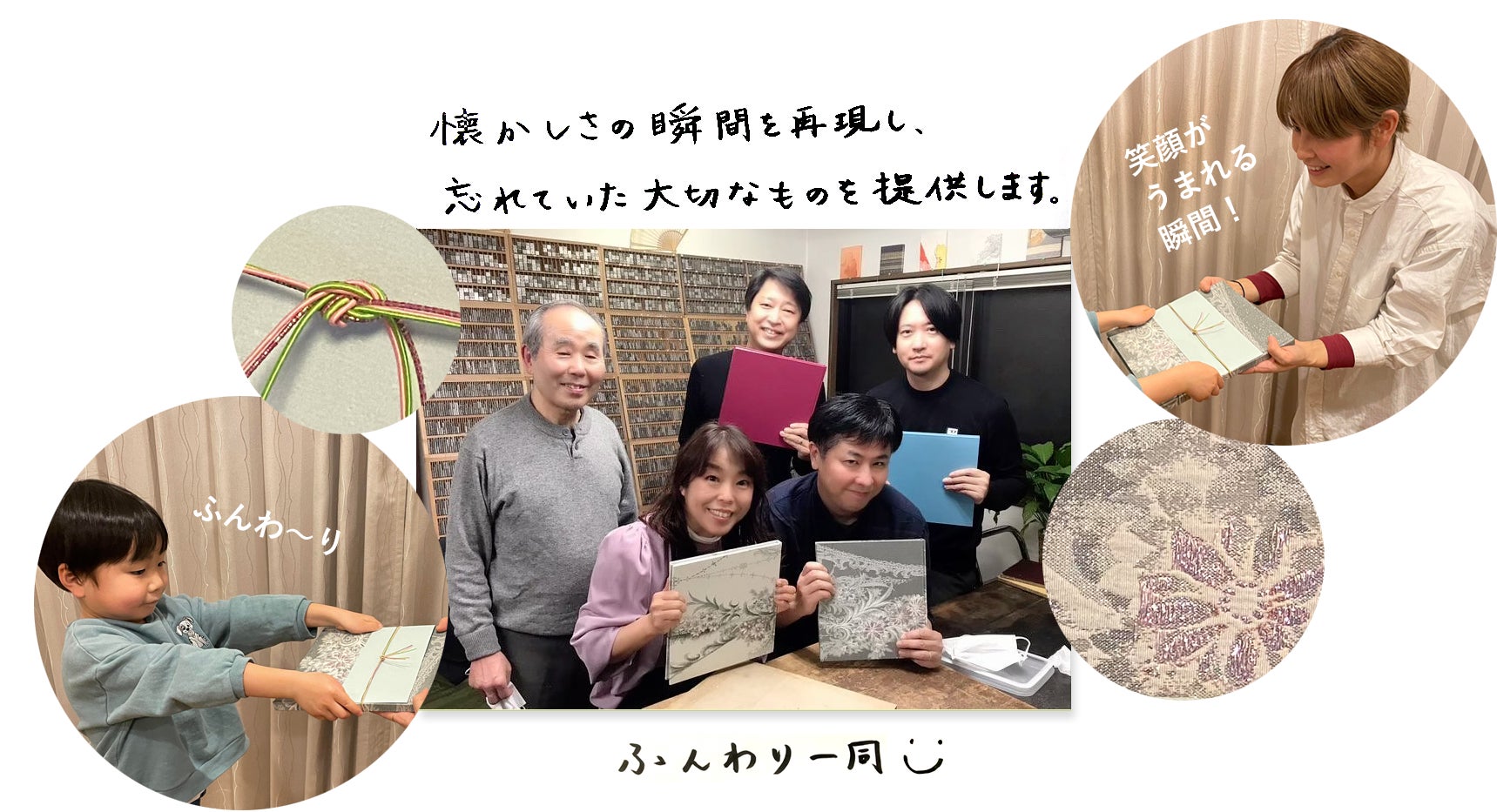 京都で技を磨き続ける松田製本処の職人から技術を伝承し、裏打ちしなめした着物生地を飾り表紙として採用しました。