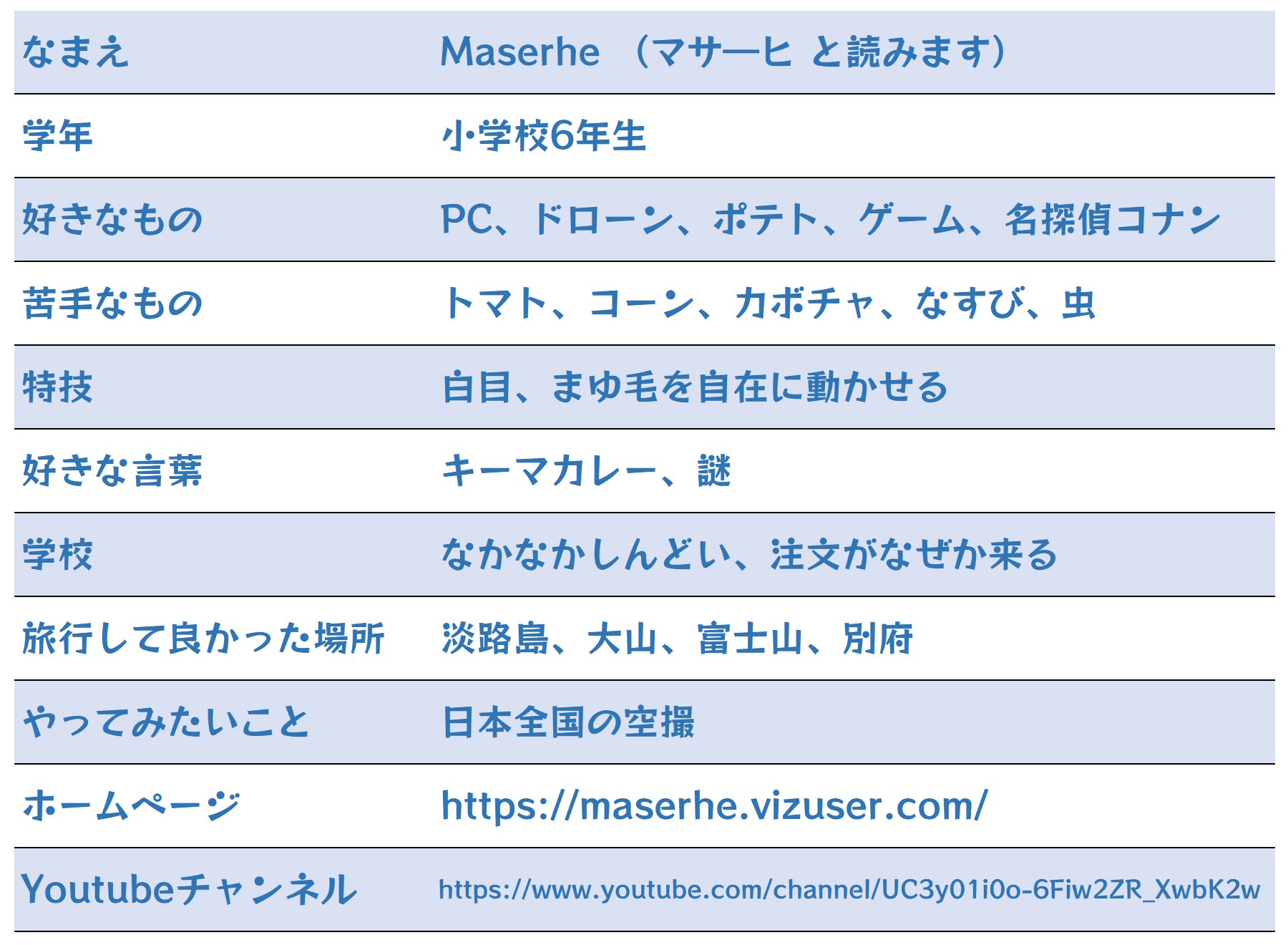 はじめまして、Maserheです(マサ―ヒと読みます)。僕は今小学6年生です。最初に自己紹介をさせていただきます。