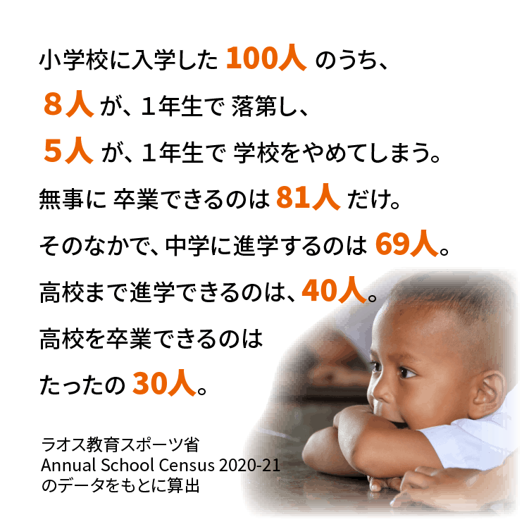 今でこそ小学校の入学率は100%近くになっていますが、ラオスの学校には進級試験があり、試験をパスしないと進級できません。小学校に入学した子どものうち、無事に卒業できるのは80.7%、1年生のうちに13.7%の子どもが授業についていけなかったり、家庭の事情で、落第したり退学してしまいます。義務教育の中学校を卒業できる子どもが、半分に満たないのが現状です。
