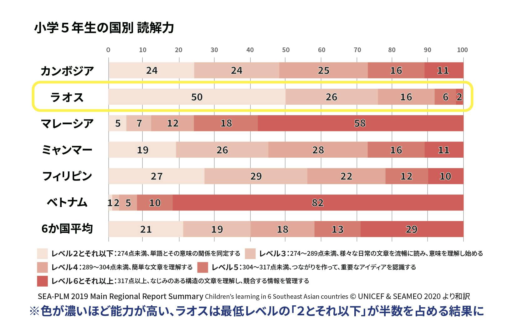 世界の中でも最貧国とされるラオスは、教育環境がまだ整っていません。2019年、ユニセフや東南アジア教育大臣機構(SEAMEO)等が小学5年生に実施した調査でも、ミャンマーやカンボジアの子どもよりも、リーディング力やライティング力をはじめとする基礎学力で、低い結果がでています。
