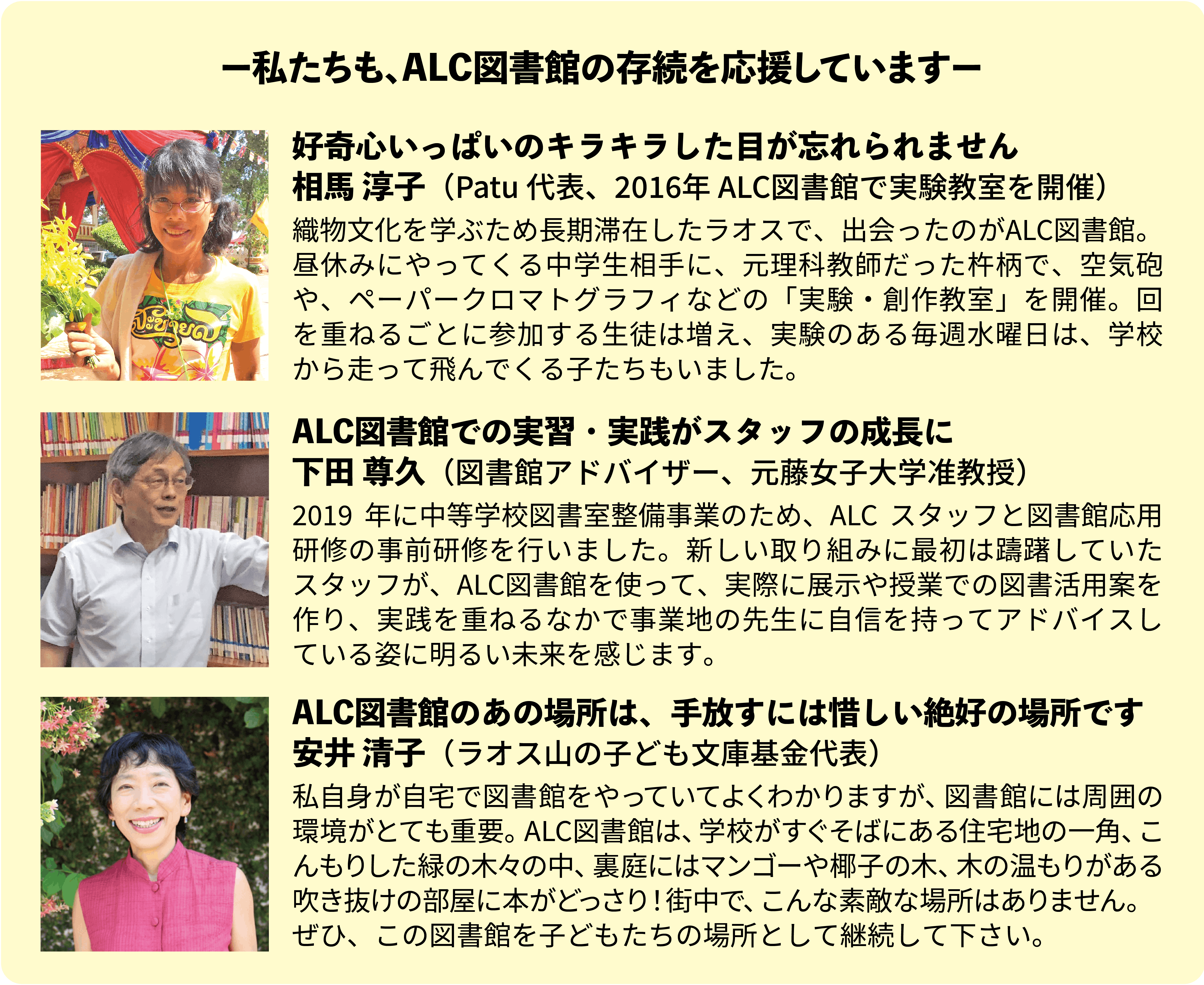 ALC図書館にゆかりのある、相馬淳子さん、下田尊久さん、安井清子さんから、心強いメッセージをいただいています!