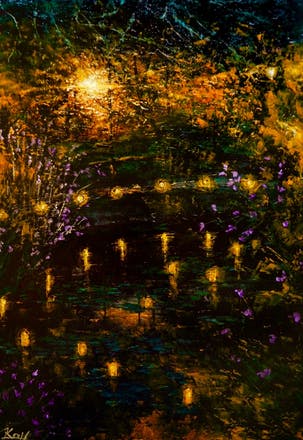 灯篭と睡蓮の浮かぶ池を描いた作品です。