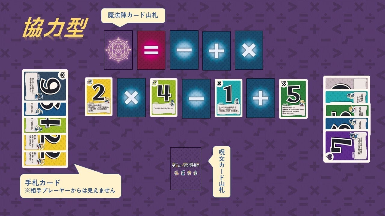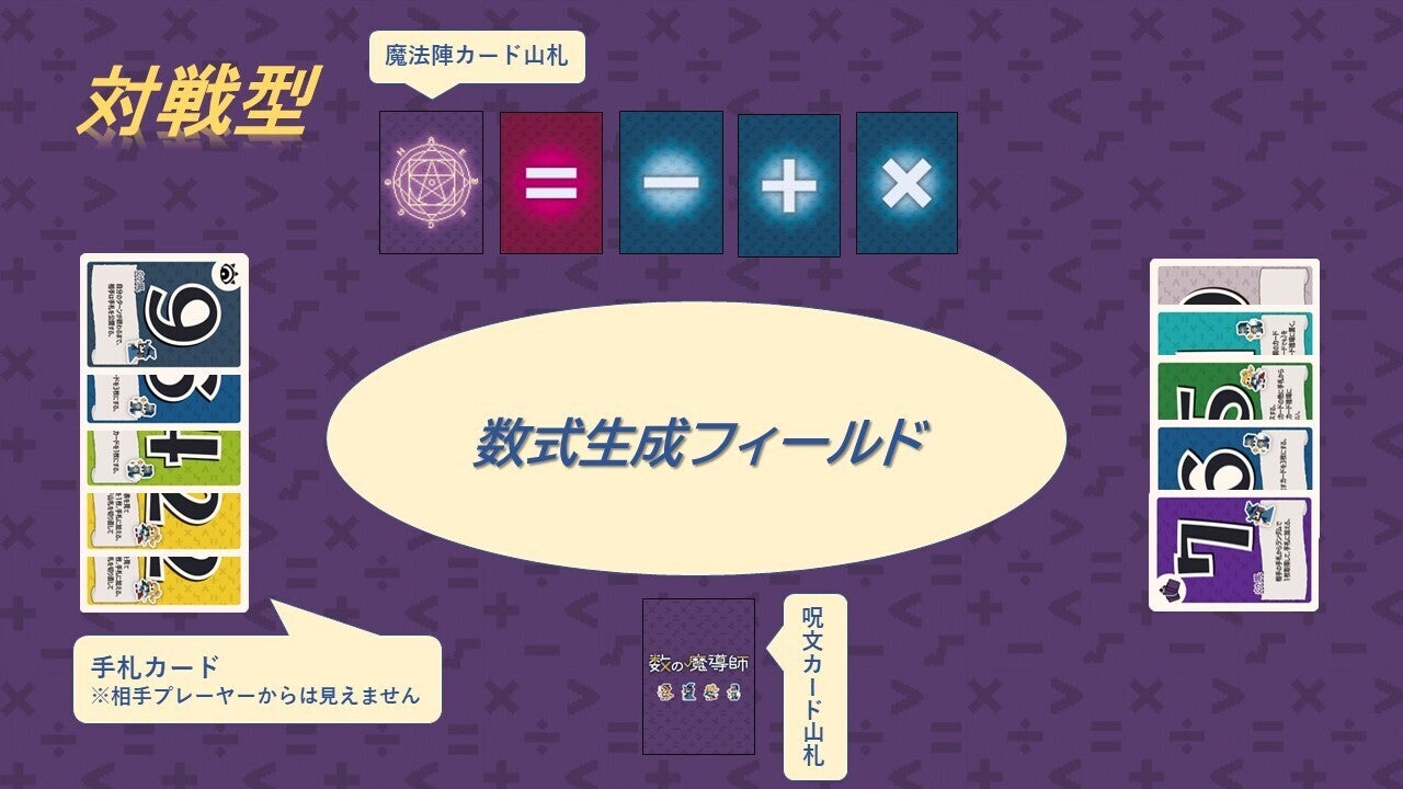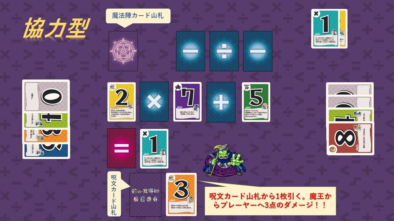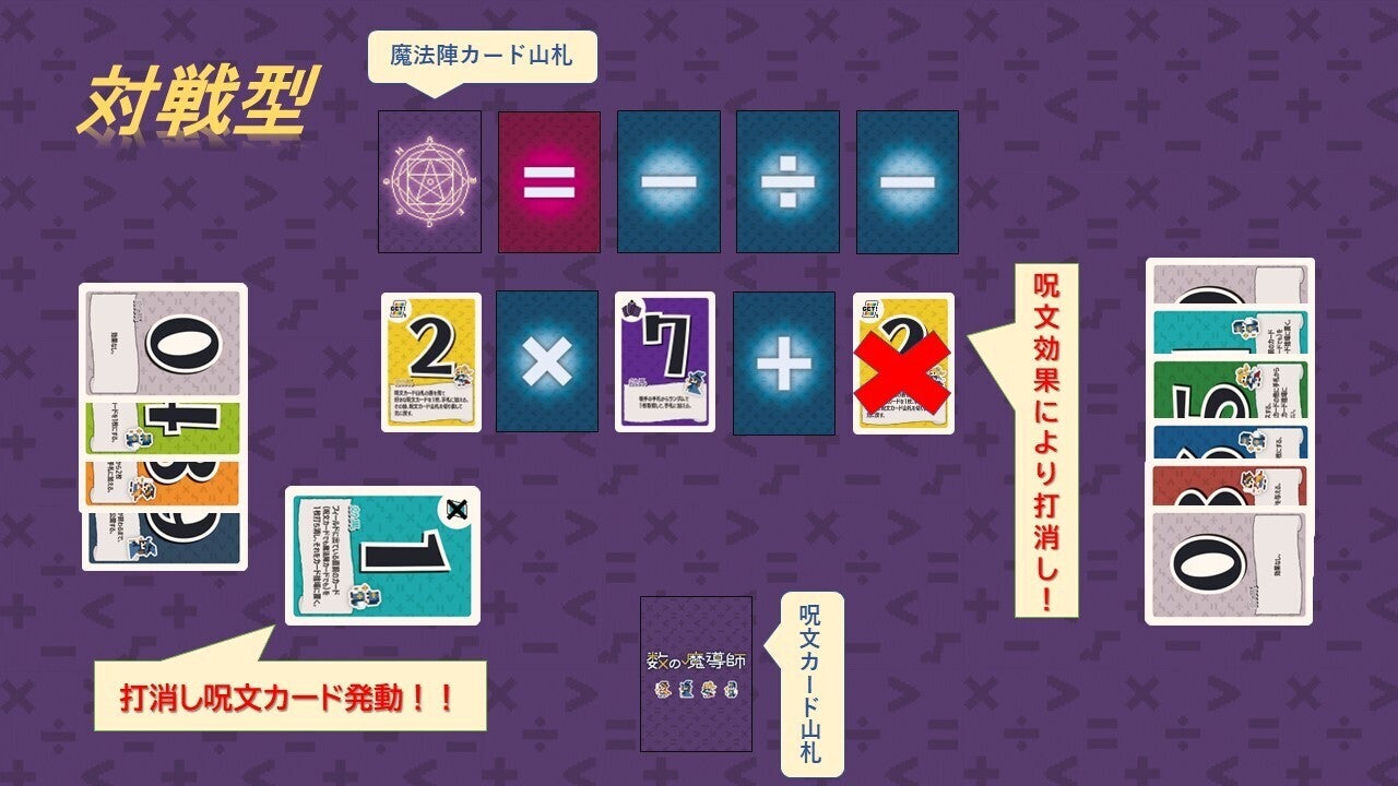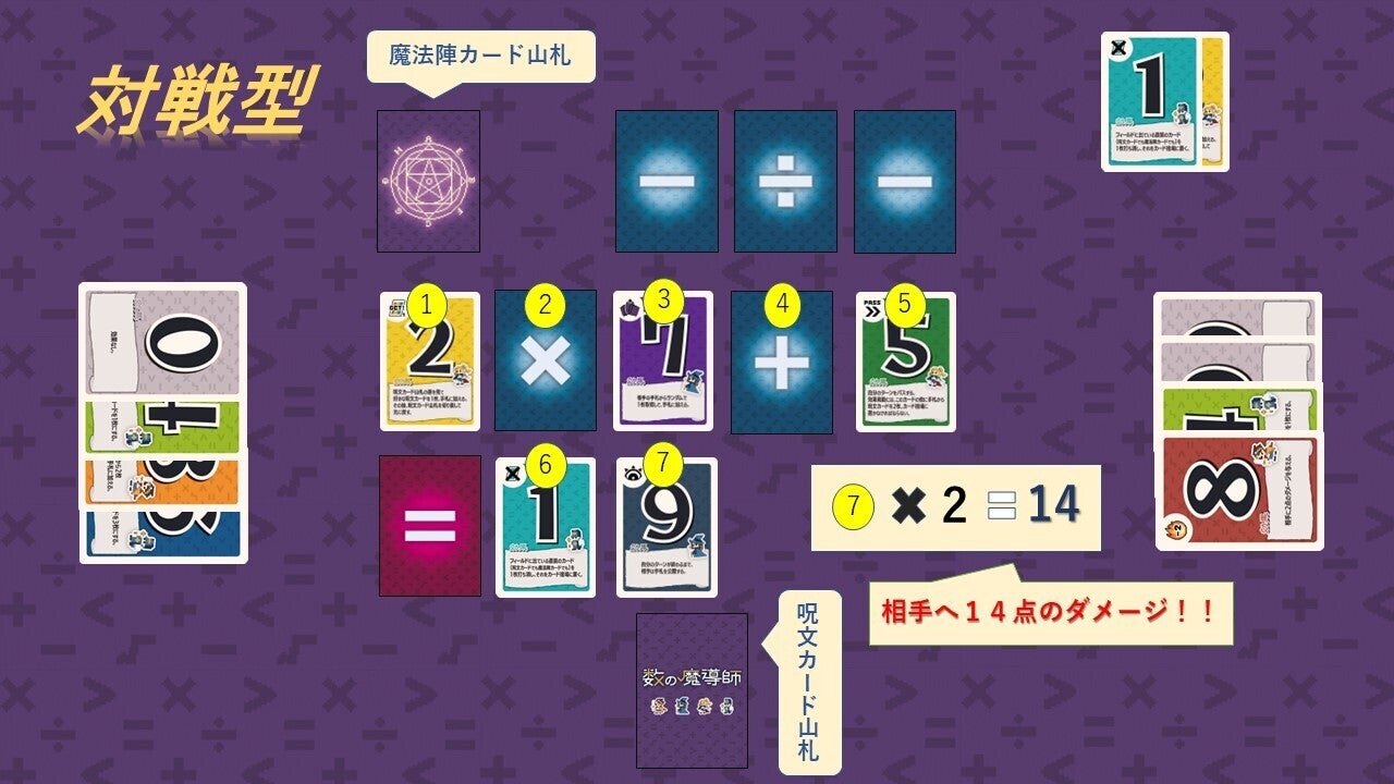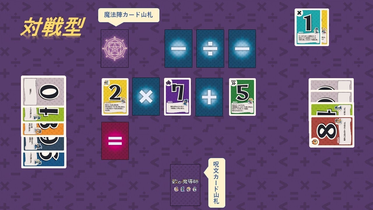 ①数字と呪文(魔法効果)の書かれた呪文カードの山札と四則演算