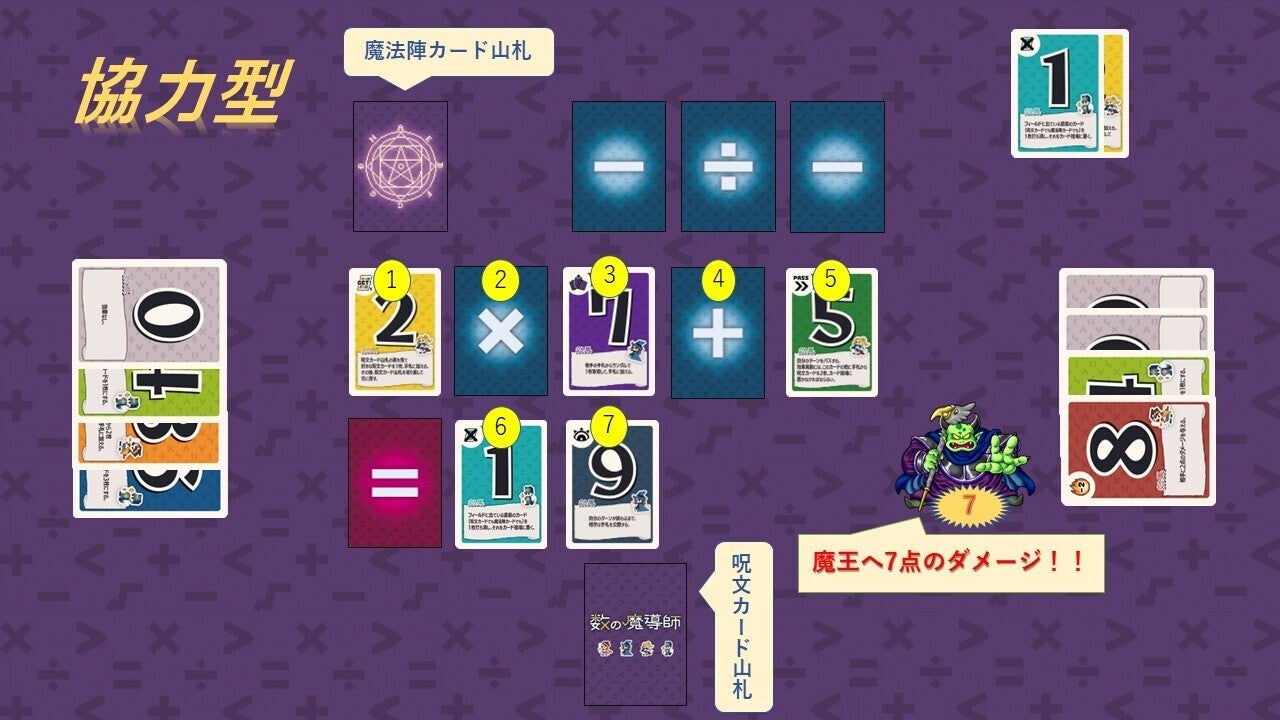 ①数字と呪文(魔法効果)が書かれた呪文カードの山札と四則演算