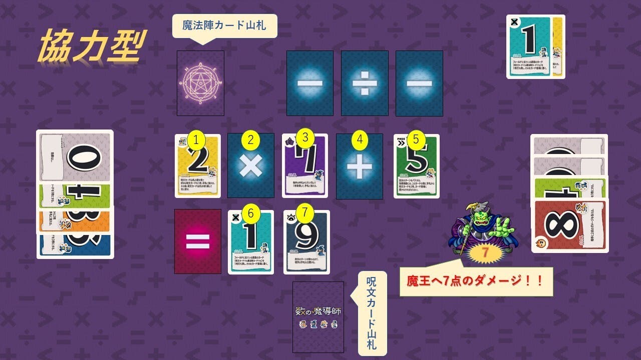 ①数字と呪文(魔法効果)の書かれた呪文カードの山札と四則演算