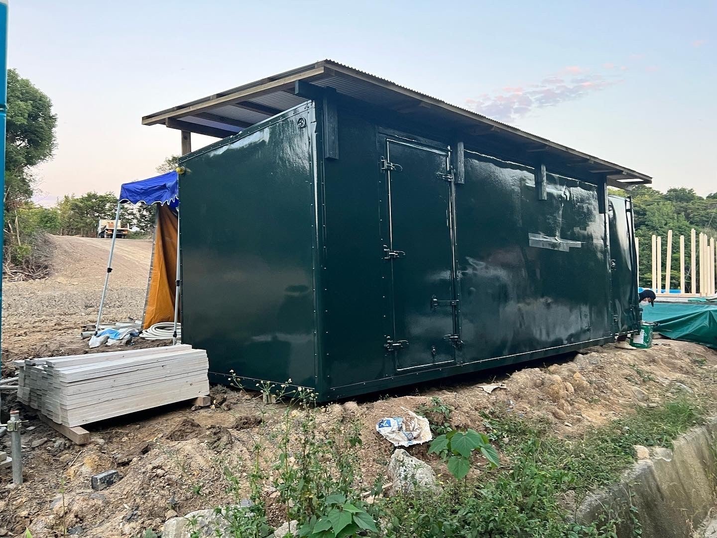 倉庫が完成しました!!渋いグリーンが良い感じの仕上がりです!中はこんな感じに棚をつくり工具などを保管!セキュリティもバッチリ!快適化がどんどん進んでいます