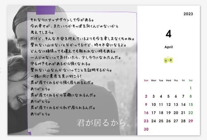 2023/12/11 13:03こんにちは~!だいぶご無沙汰しておりました。お元気でしたでしょうか?ちょうど一年前、初めてのミニアルバム「言の葉」が完成して発送準備をしていた頃だなぁ~と、懐かしく、そして改めて感謝の気持ちでいっぱいです。すべての治療を今年2月に終えて、最近は副作用も消え去り、とても元気に過ごせています。さて、今年も卓上カレンダーを作りました!ライブ配信を始めてから卓上カレンダーを作って、今回で・・・3作目?4作目?既に記憶が曖昧ですが(笑)2024年の卓上カレンダーは、公式LINEでの呼び掛けで風景写真をご提供下さった皆様とのコラボカレンダーです!(公式LINEのご登録はこちら→https://lin.ee/dzgw0BX)詩は歌詞の一部を抜粋していて、それぞれの月にQRコードが付いています。スマホで読み取るとyoutubeが起動して対象月の曲が聴けたり、ARの仕掛けでフォトフレームになったりします。先行予約頂いた分は、今週末にはお届け出来るかと思いますのでもう少しお待ちくださいね♪卓上カレンダーは、12月15日までご予約を受け付けております。https://ayamenko.stores.jp/そして、「言の葉」を作る切っ掛けを作って下さり、コーラスを担当してくださった、シンガーソングライター流さんのニューアルバム「Wild flower」が今月リリースです!先行予約で一足先に聴いておりますが、とてもとても素晴らしいアルバムです!音楽プロデューサーは、佐藤亙氏です!MVもとても素敵なので、是非ご覧ください♪https://www.youtube.com/watch?v=g2gHvNmBvX0本年もお世話になりました。2024年が皆様にとって良い一年になりますように。 もっと見る
