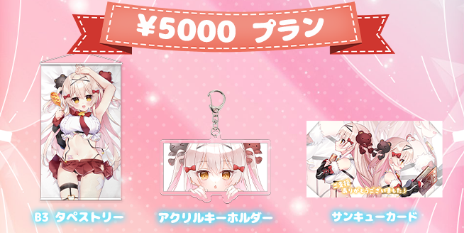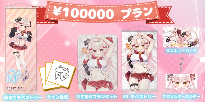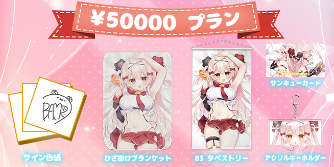 5万円プランのグッズに加え、等身大タペストリーがセットになっております。