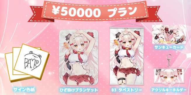 5万円プランのグッズに加え、等身大タペストリーがセットになっております。