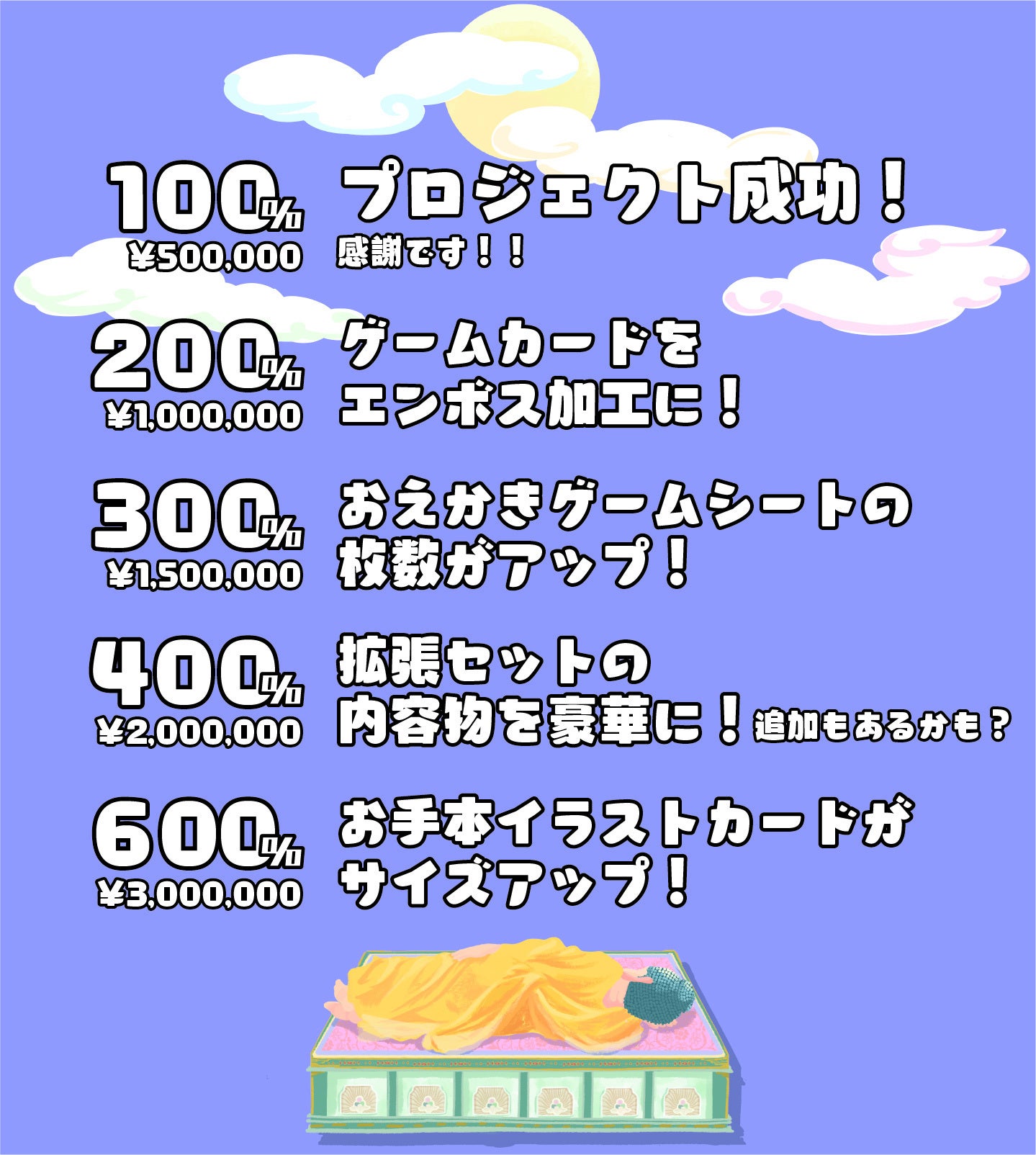 まだまだ日程がございます。つづきまして100万円を目指したいと存じます。そこまでいけましたらば、基本セットや拡張セットが想定以上にクオリティの良いもの、中身を増やしたりもできます。