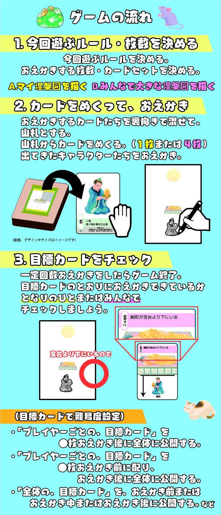 (例 A.マイ涅槃図を描くルールの場合は、目標カードの達成具合を自分でチェックするのではなく、となりのプレイヤーに判定してもらいましょう)