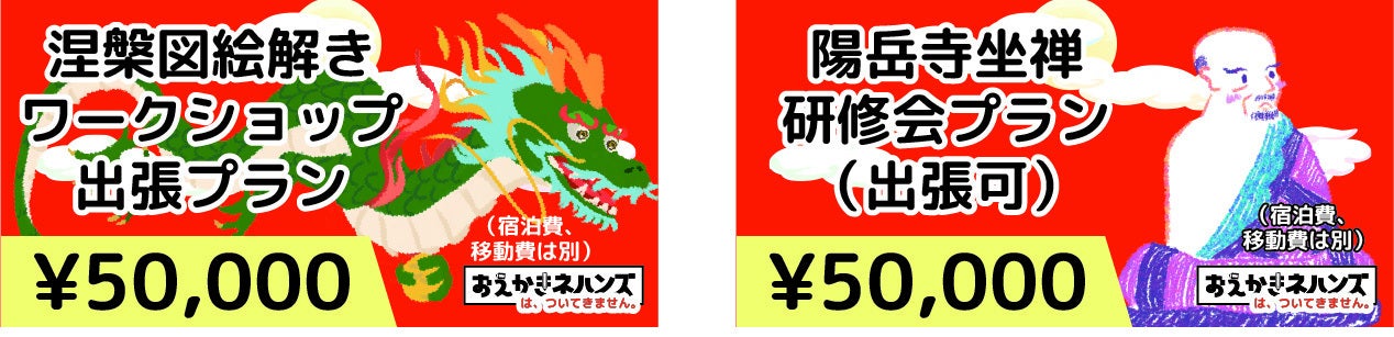 ・¥50,000◯涅槃図絵解きWS出張プラン:起案者向井が、あなたのご希望の日時や場所で「涅槃図絵解きワークショップ」を出張して行います。開催時期や内容などは相談いたしましょう。(移動費、宿泊費は別)(有効期限:2024年2月末まで)(『おえかきネハンズ』は含みません)