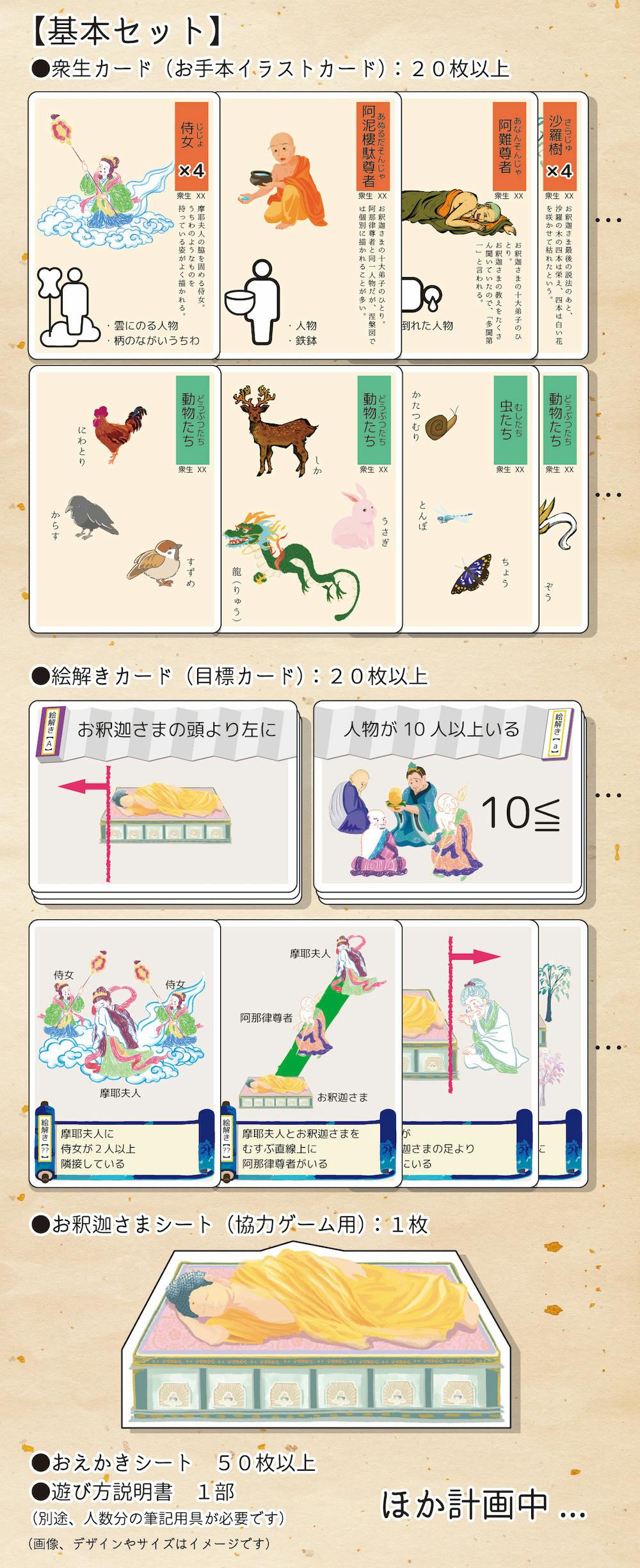 拡張セットをお求めいただきますと、目標カードを増やすことで着眼点が深まったり、お手本イラストカードと目標カードの組み合わせを増やすことでリアル涅槃図により近づけることができたり。ほかにも・・・