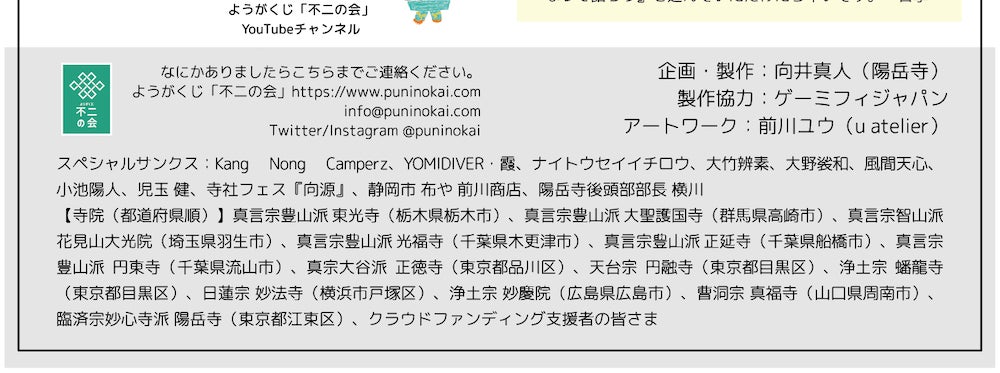 こんにちは、向井です。今回は、15,000円以上のプランにつく「説明書へのお名前掲載」形式についてのご説明をいたします。# 15000円以上のプランにつく「説明書へのお名前掲載」形式についてドルがめちゃくちゃ上がっております昨今、いろいろと日用品、お寺回りも上がっております。そんななか15000円ものご支援賜りました、本当にありがとうございます。15000円以上ご支援をいただきました方には、説明書に文字でお名前を掲載、をさせていただいております。「伝統仏教のお寺」は別枠で掲載をさせていただきます。都道府県順に、「宗派 寺院名(都道府県+市区町村)」となります予定です。地域によっては、「宗派と寺院名」がまったく同じお寺さまがいらっしゃる場合もあると存じます。そのようなときは「山号」についてもおのせいたします。アイキャッチにもありますが、以下の画像は、『WAになって語ろう新版』カードゲームの説明書記載欄です。『おえかきネハンズ』でも、このように「スペシャルサンクス」にて個人名、ペンネームやブランド名など。そして【寺院(都道府県順)】をご掲載いたします。WAになって語ろう新版 説明書の記載欄もしこれからご支援をお考えの方は、ご参考になさっていただければと存じます。また、すでにご支援いただいている方は、「500円プラン」などで合計にて15000円以上までいただきましたらご掲載をさせていただきます。よろしくご検討のほどお願い申し上げます。