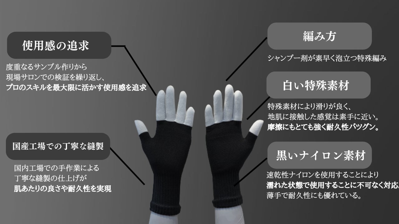 理・美容師専用のプロ仕様のシャンプーグローブです。素材はニット素材(ナイロンなど)で 抗菌・防臭・速乾機能搭載。