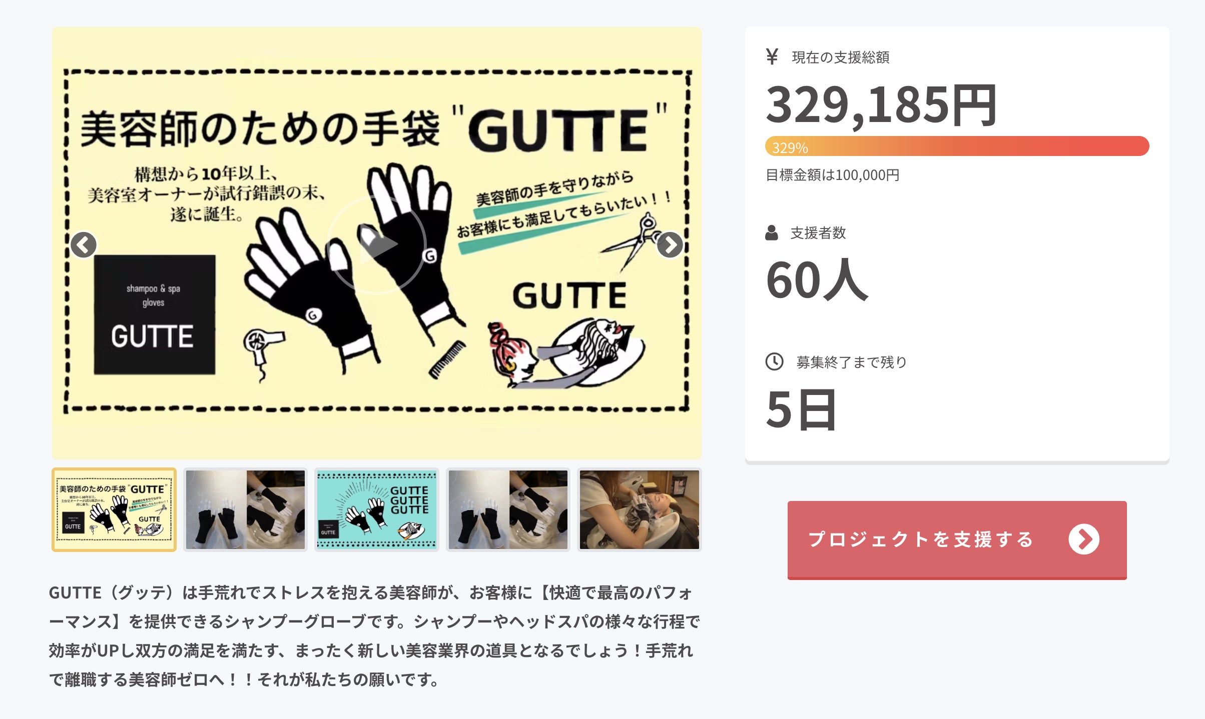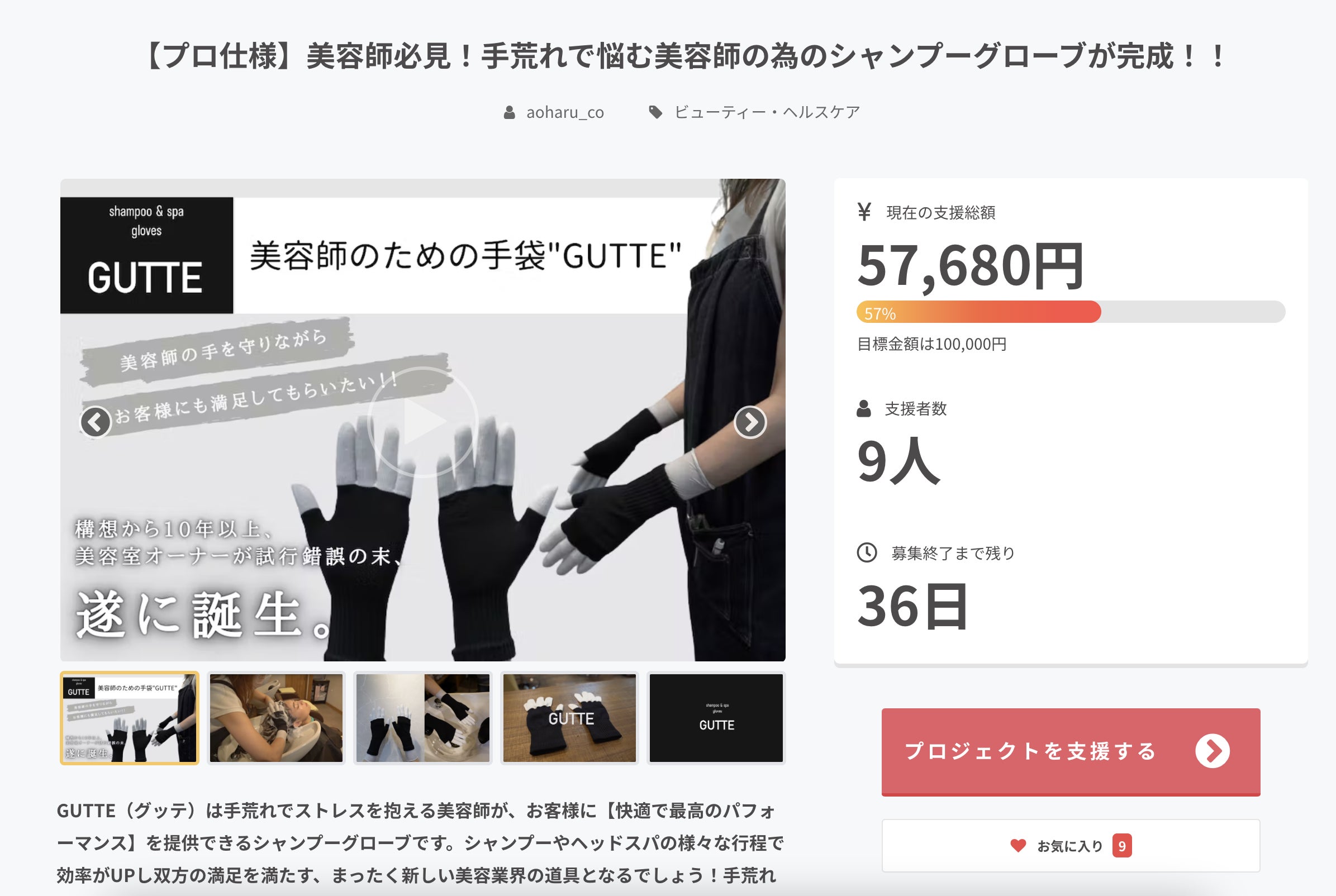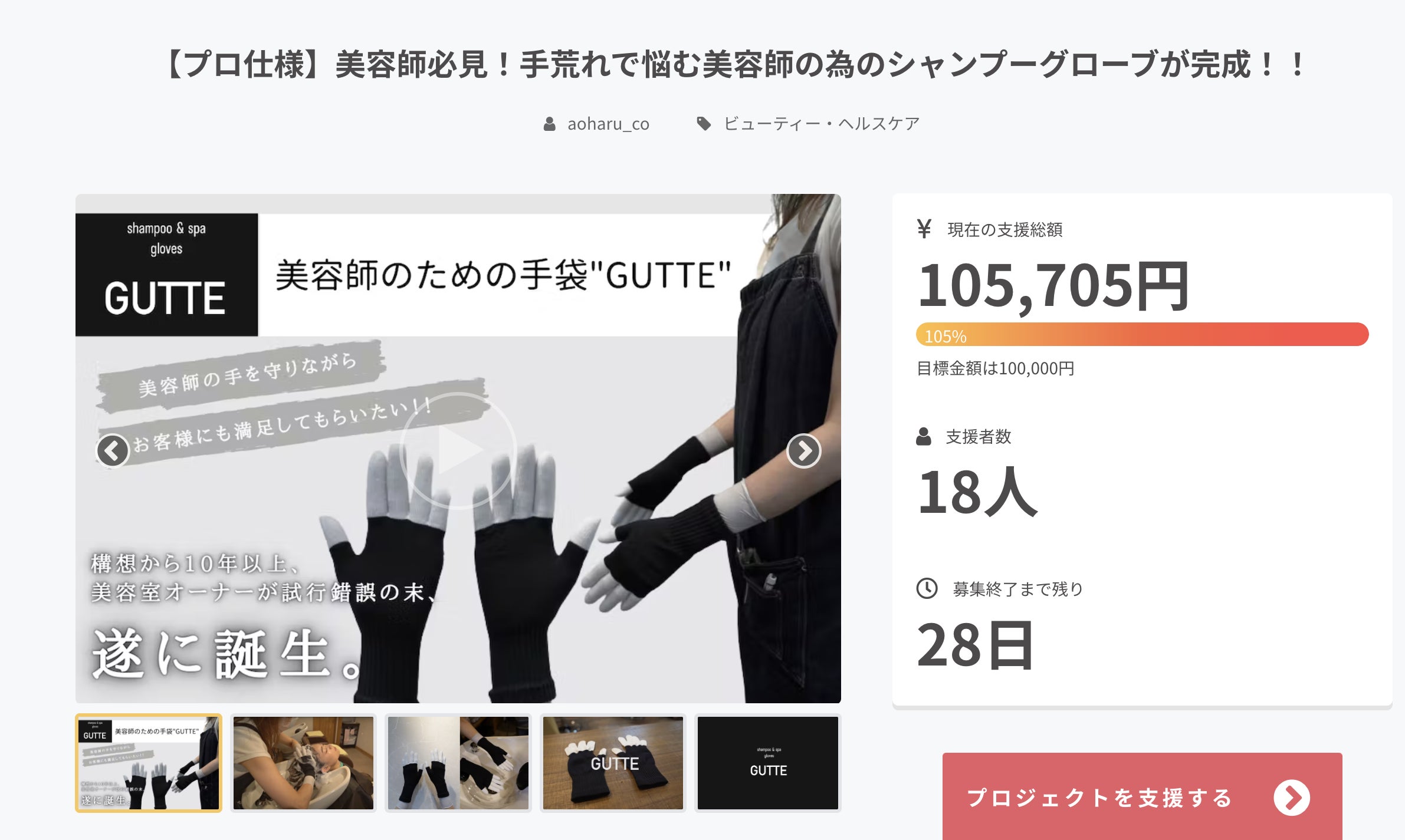 2022/10/18 13:19手荒れで悩む美容師の為のシャンプーグローブ「GUTTE」が支援目標の100%を超えるご支援いただきました!多くの支援者様に心より感謝申し上げます!ありがとうございます!残り28日、まだまだ募集中です!引き続き「GUTTE」をよろしくお願いします! もっと見る