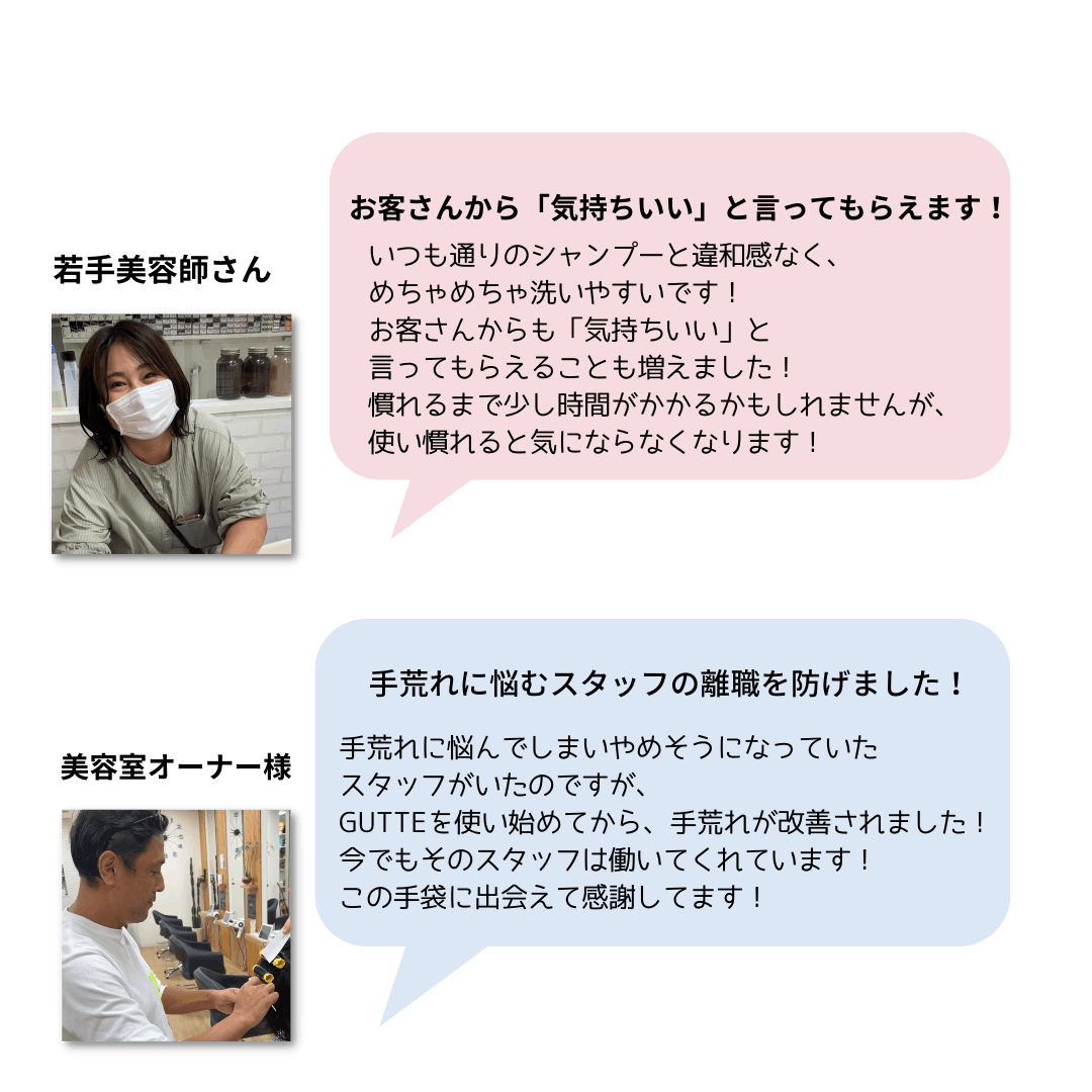 GUTTE(グッテ)は手荒れでストレスを抱える美容師が、お客様に【快適で最高のパフォーマンス】を提供できるシャンプーグローブです。シャンプーやヘッドスパの様々な行程で効率がUPし双方の満足を満たす、まったく新しい美容業界の道具となるでしょう!手荒れで離職する美容師ゼロへ!!それが私たちの願いです。