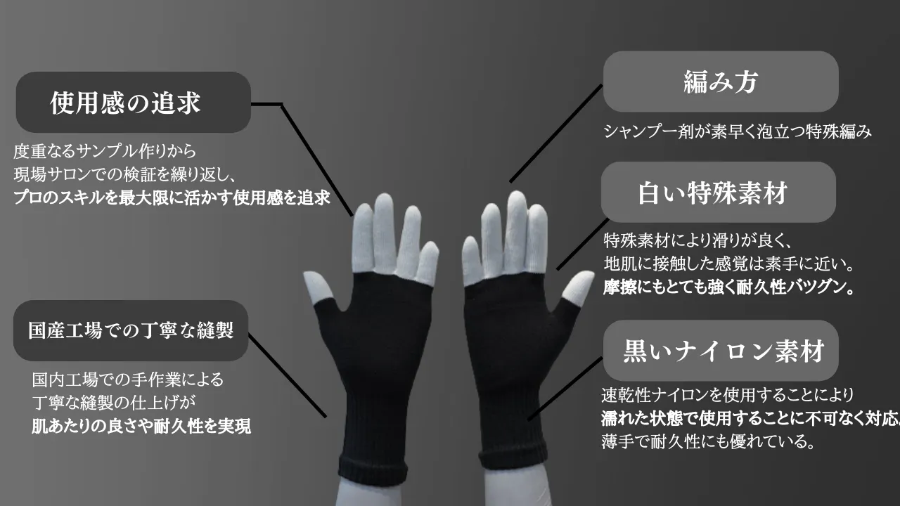 しかし、美容業界ではニット手袋を着用してシャンプー業務を行うことはほぼ無く、本当に満足を得られる物なのか疑問視されると予想しましたので、商品の詳細だけじゃなく開発への熱意や想いが伝わるクラウドファンディングでしたら共感してくれた方々が試してくれるかと思いこのプロジェクトを立ち上げました。