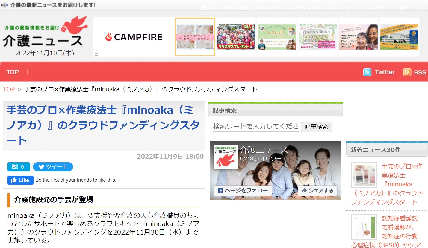 minoakaのクラウドファンディングが【介護ニュース】さんというネットニュースに取り上げて頂きました!