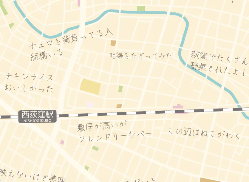 西荻という地域にいる人たちと、西荻の地図をみながらおしゃべりをするイベントをやったら楽しいのではないかと考えました。そのイベントの準備のために西荻の地図を自分達でつくってみたら、地図を作ることが楽しいということを見つけたことがきっかけです。
