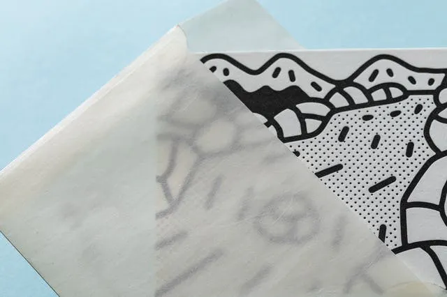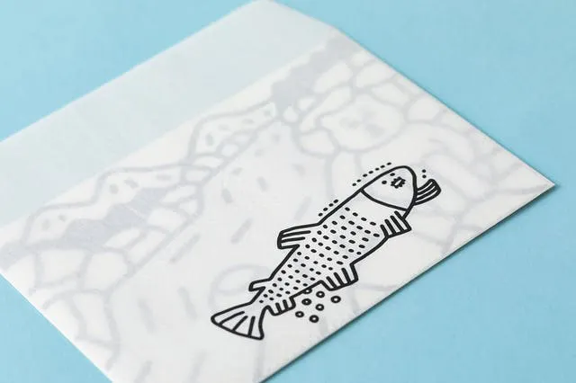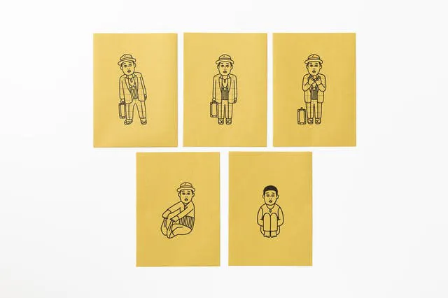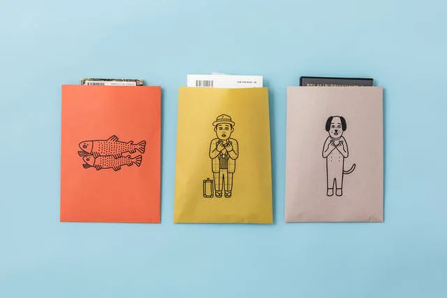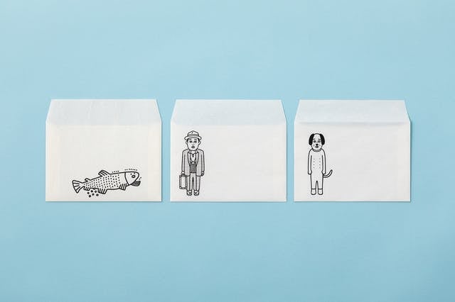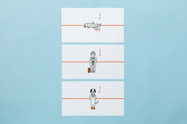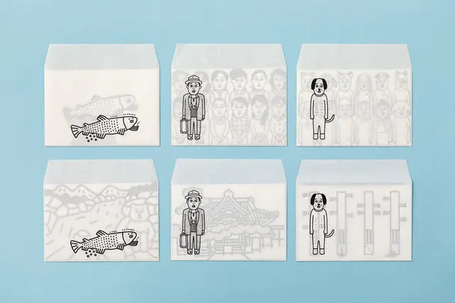 封筒を透ける素材にしたことで、便箋の絵柄が背景となって一体化。「しゃけ」「旅人」「犬」が帰ってくるまでの長い旅路の中で巻き起こったストーリーを感じさせるデザインになっています。