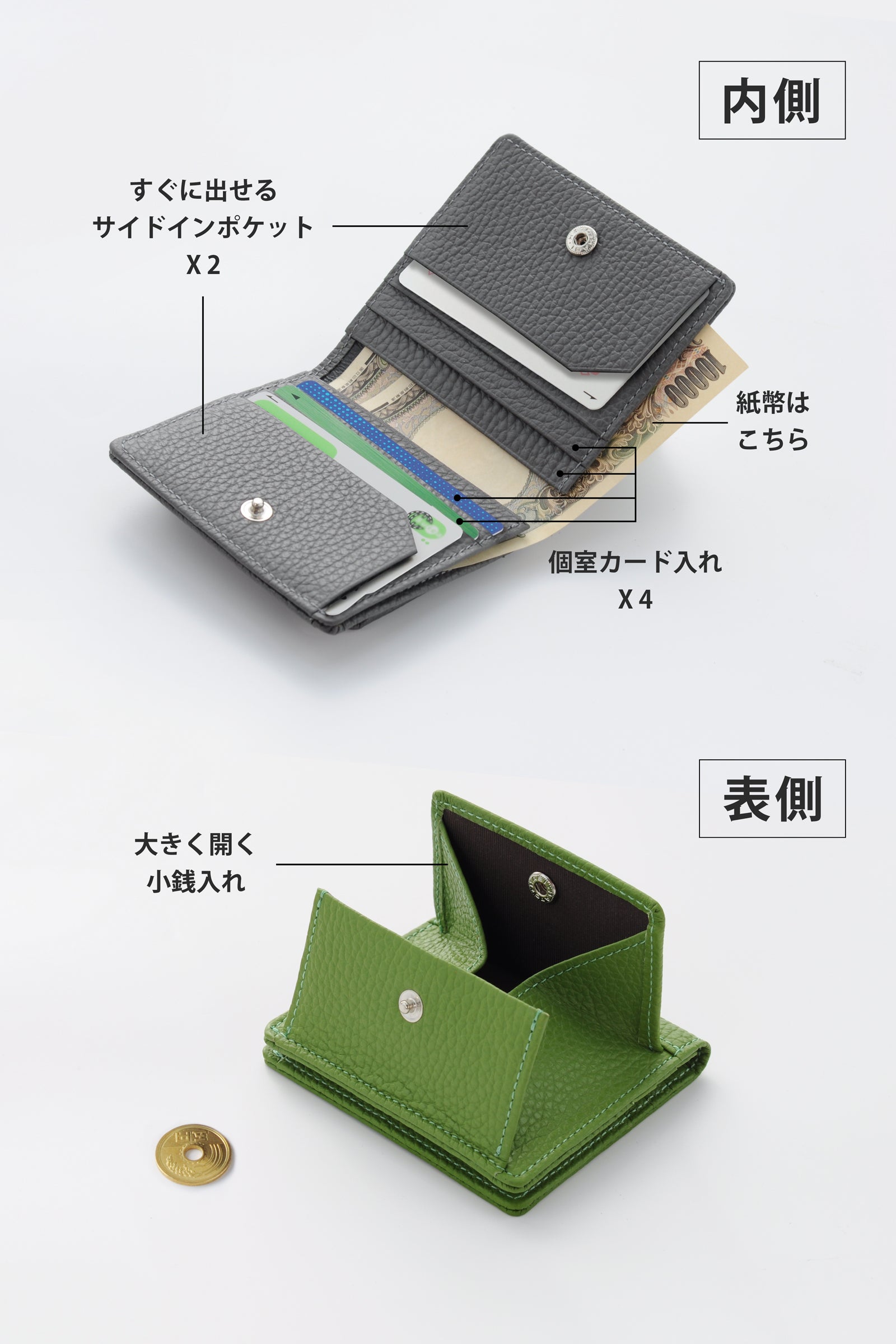 そして、よく使うカードは2か所のサイドインポケットに入れることで、さらに出し入れしやすい構造にしました。