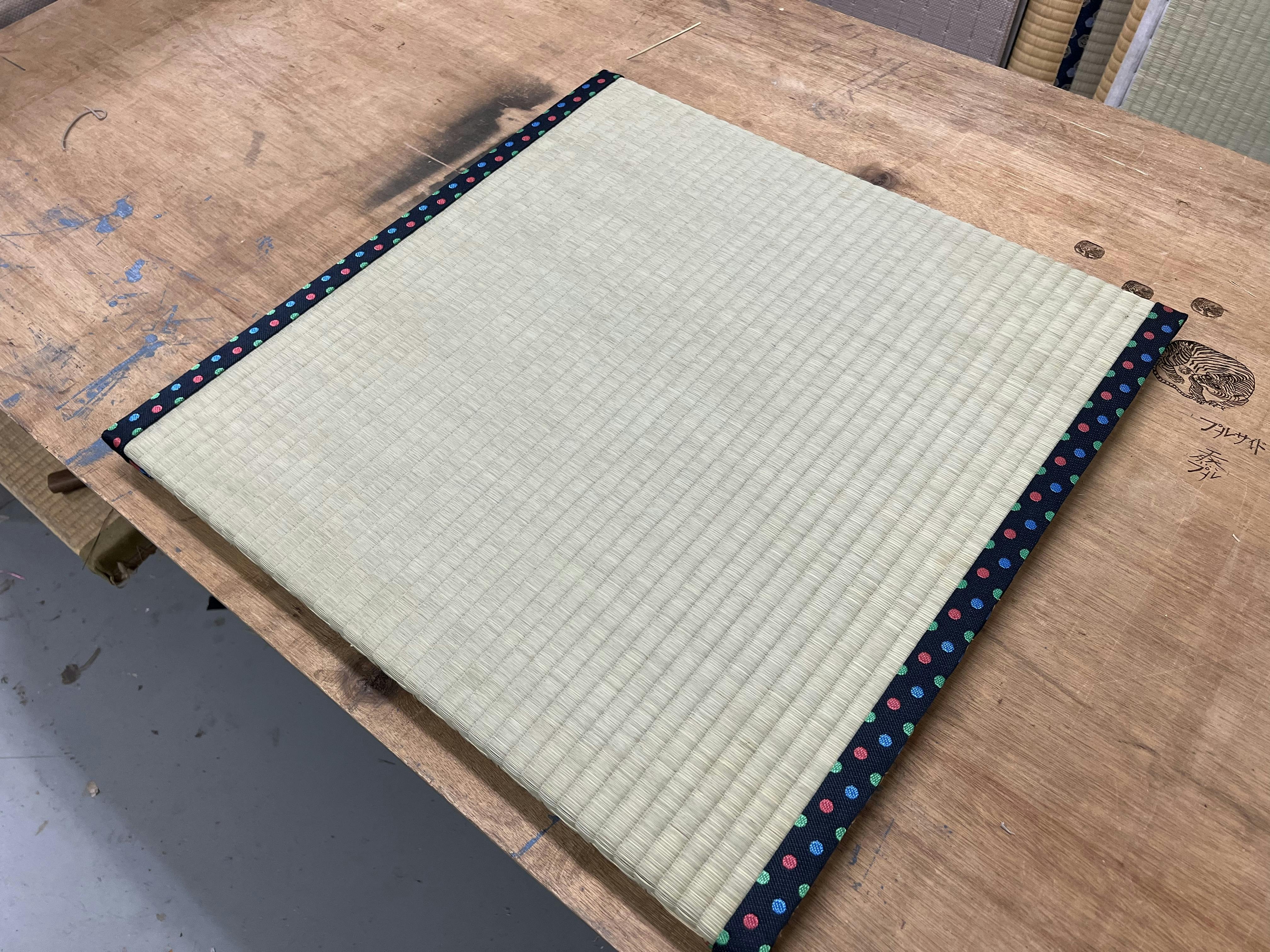 写真は古着を藍染めをしたものと、マンションでも使えて、持ち運びできる畳です。