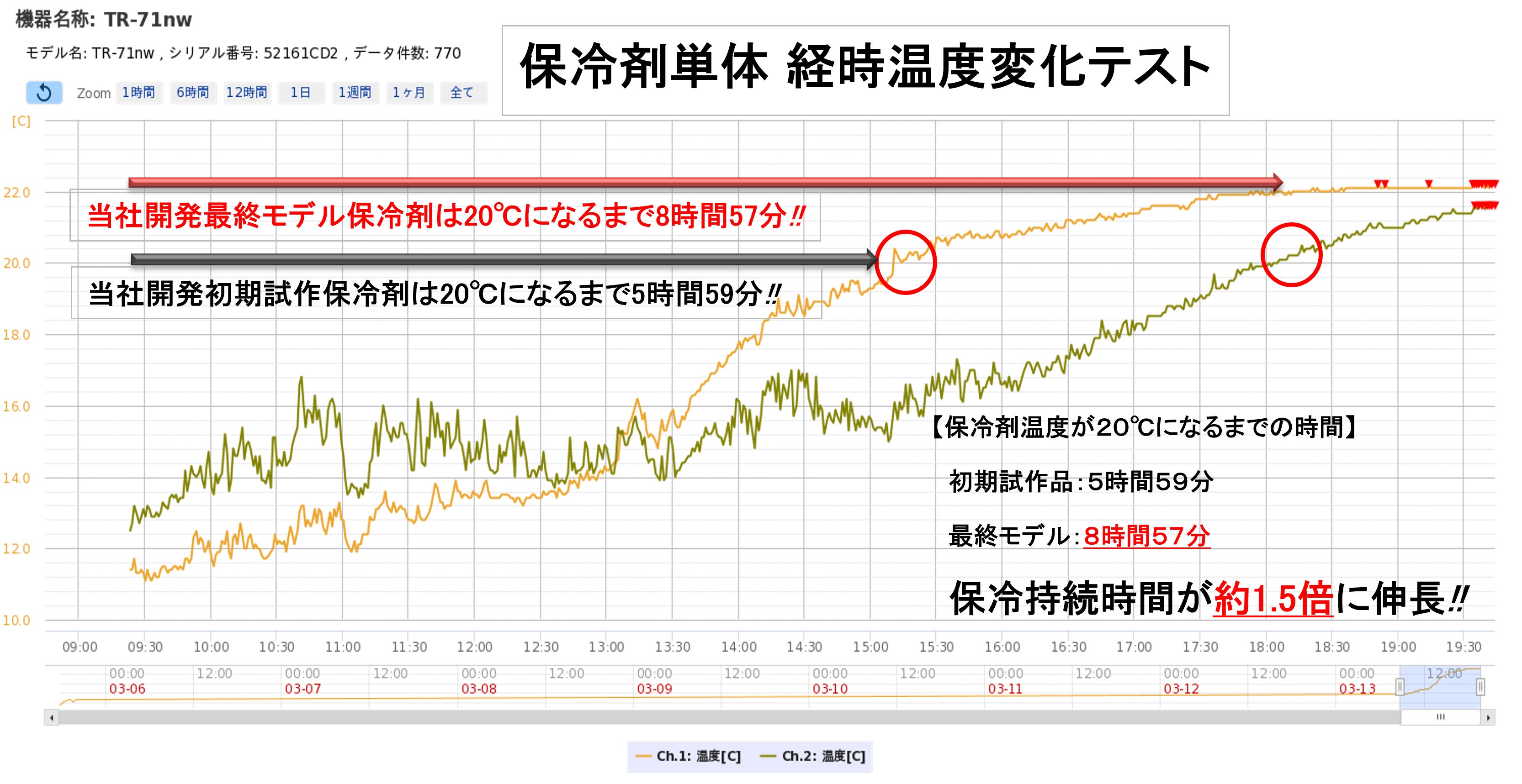 保冷剤が20℃になるまでの保冷持続時間は、気温30℃の環境下では5時間以上持続するものと思われます。