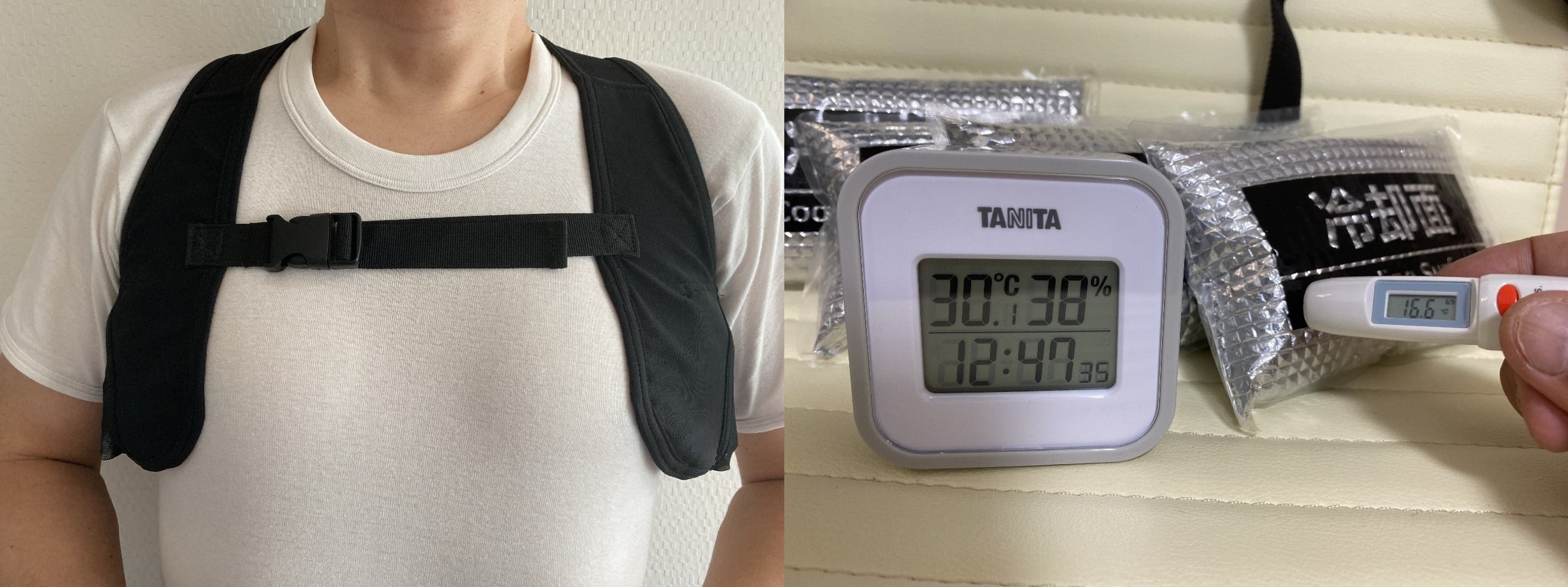 では、実際に装着してみたらどうなのか? という最終テストも行いました。冷凍庫で10時間凍らせた保冷剤8個を用意し、保冷バッグに4個、ベストに4個を装着します。