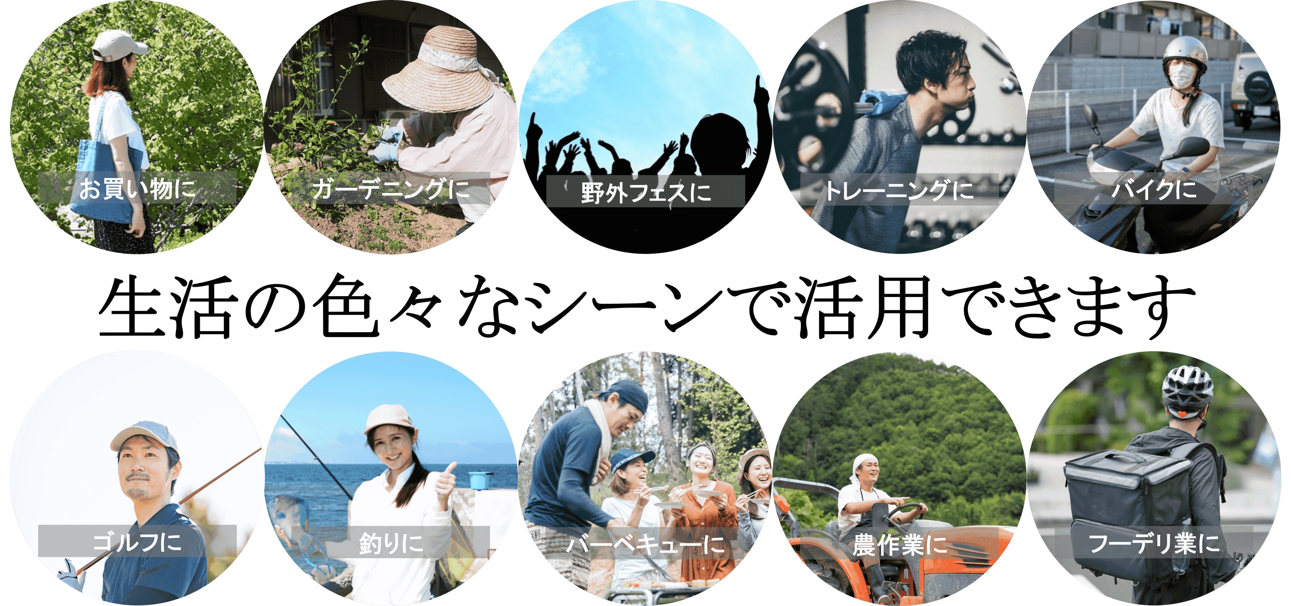 配達作業や農作業、バーベキューやゴルフなど、屋外の作業やレジャーに幅広くご活用できます。