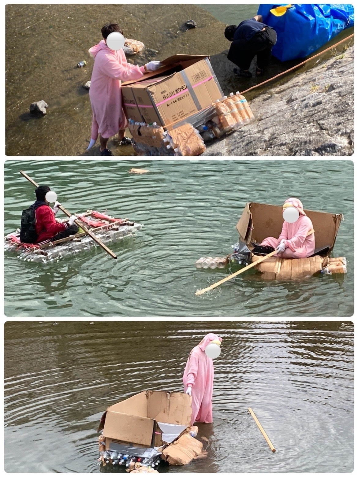 12月の鴨川を自作のいかだ(突貫工事で作成)で渡ります。いかだが壊れたら?もちろん泳ぎます。