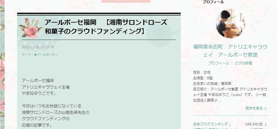 こんにちは。湘南サロンドローズです。福岡サロンドローズの講師をご担当いただいているアールポーセのインストラクターのyukoさんがサロンドローズのクラウドファンディングを記事にしてくださいました!『”アールポーセ福岡 【湘南サロンドローズ 和菓子のクラウドファンディング】”』こんなに嬉しい事はありません。yukoさんは、クラウドファンディングのご支援もしてくださっています。お嬢様と一緒におうちで練り切り和菓子体験をお楽しみいただく予定です♡とても素敵な作品をつくる方なので彼女の素晴らしい感性をぜひご覧ください。