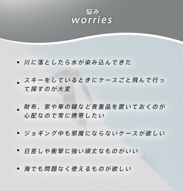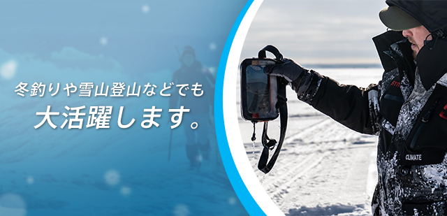スキーや釣りなどのアクティビティでは貴重品が濡れないことはもちろん、衝撃にも強くなければいけません。