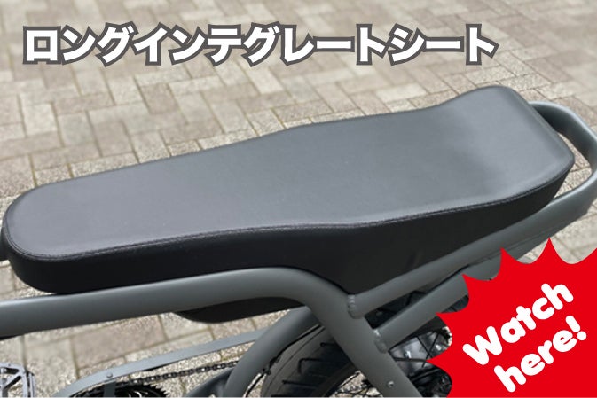 シートは、オリジナルのロングインテグレートタイプ 輸出も考えていますので、外国では二人乗りもできる地域もあり、ライディングポジションが取りやすい余裕を持ったスタイルにしました。バッテリーはシートの下に装着されます。