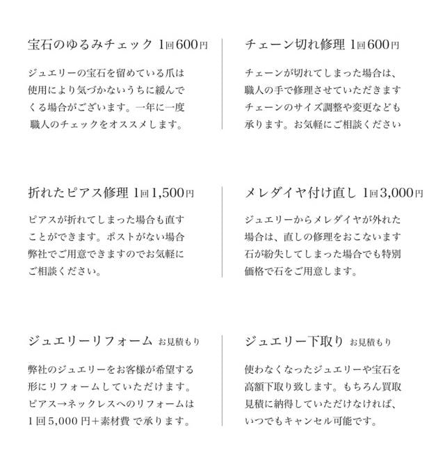そのため私たちは、ジュエリーはブランドへの入会状と考え、クリーニングやサイズ直し、故障といった「いざ」というときのためのサポートはもちろんのこと、リフォームや買い替えサービス、紛失サポートなど、徹底的にお客様に寄り添っていきます。