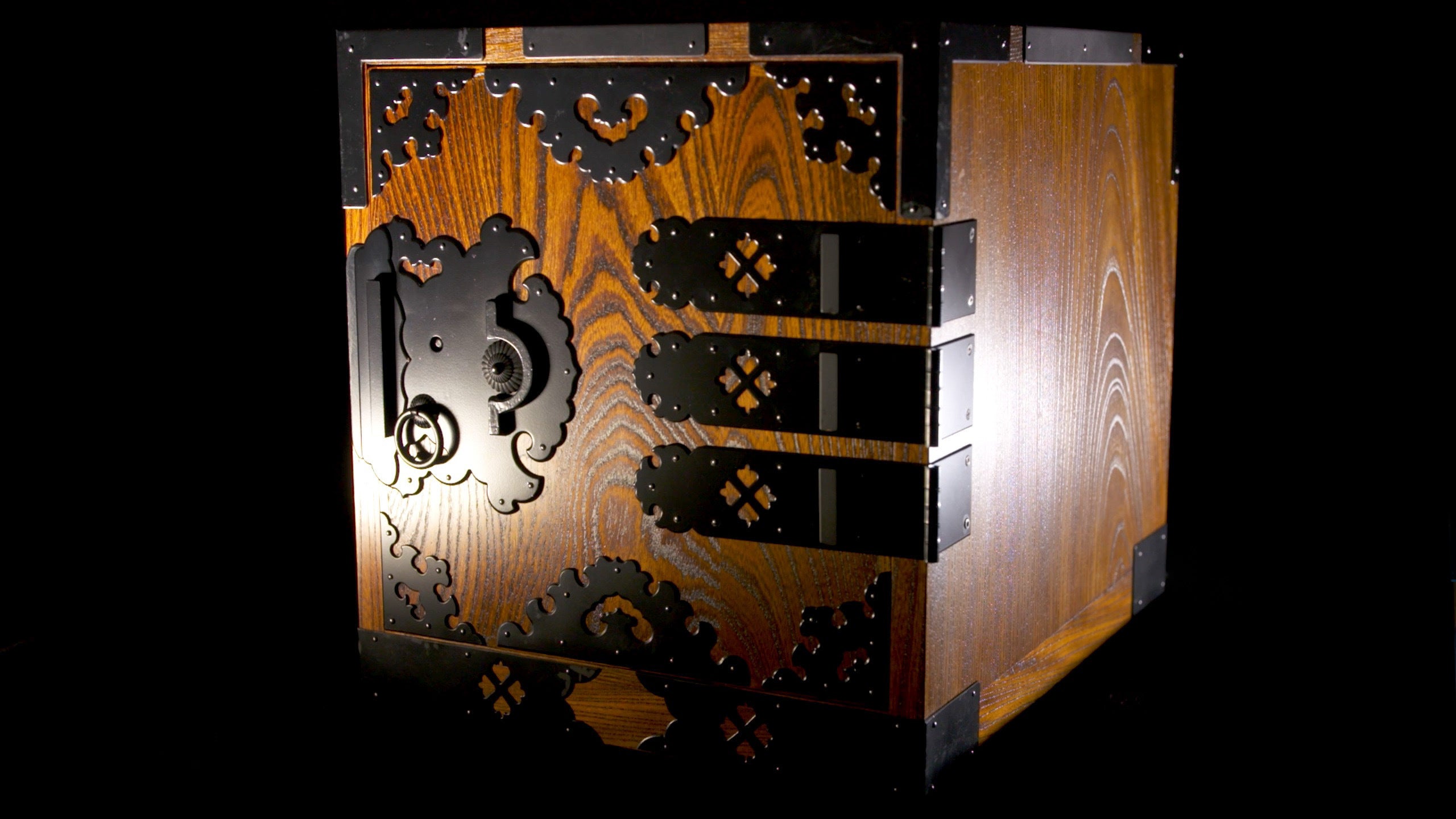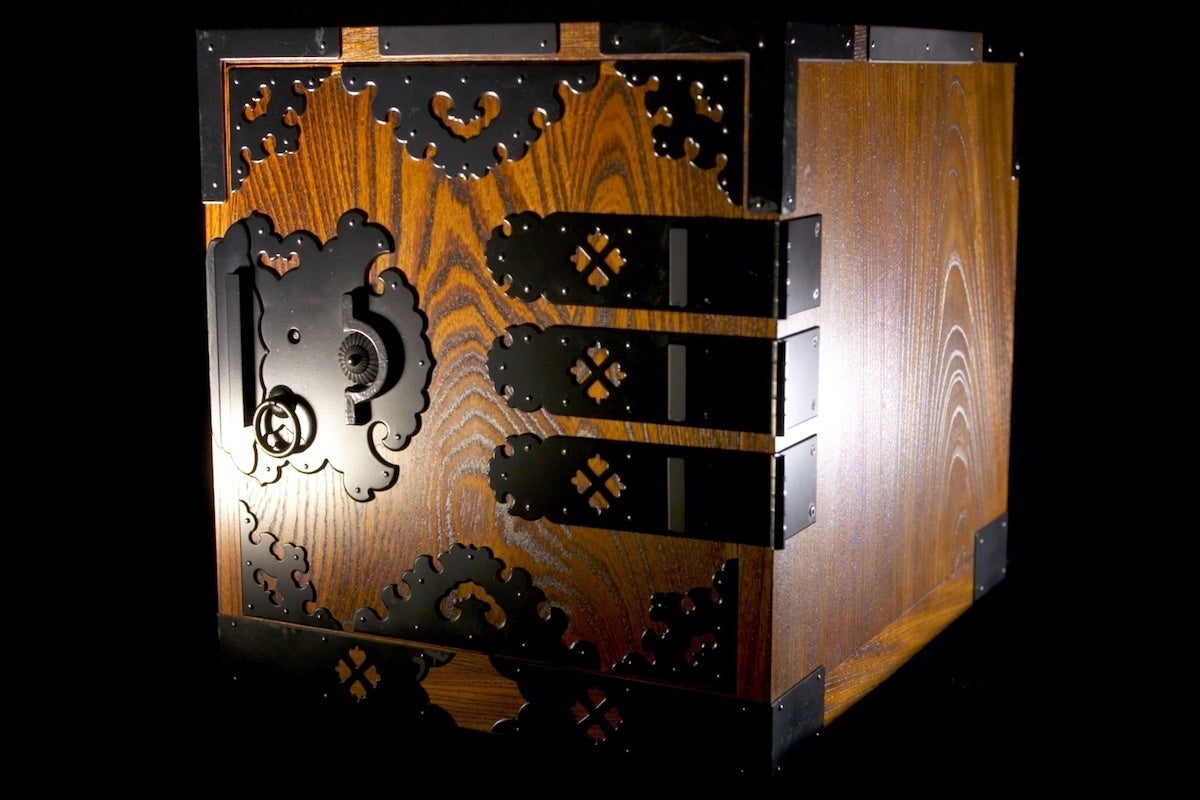 外装は硬い木材の欅(ケヤキ)が指物で組み立てられ、鉄で作られた装飾金具が取り付けられて、漆塗で塗装されています。引出しは桐(キリ)で作られ、外装との隙間は0.2mm程度とほとんど隙間がありません。