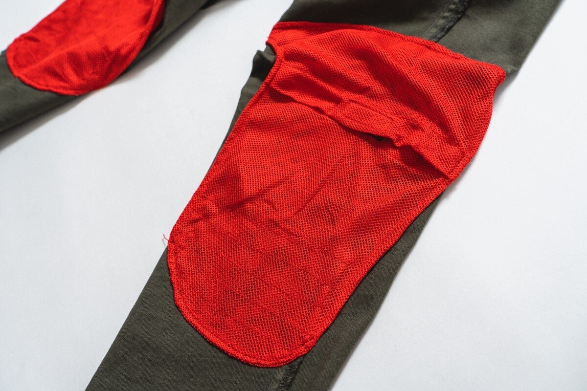 膝と腰にプロテクターポケットを搭載、左右膝のプロテクターは内蔵してお届けいたします。プロテクターCE Level1膝を曲げた際にプロテクターがしっかり膝位置に来るように設計。プロテクターの装着は裏側から入れる仕様になっています。外側からプロテクターを装着出来るようにすると、膝横にファスナーを取り付ける必要があります。ファスナーがあると膝を曲げたときに膝部分にふくらみが出たり、いかにもライディングパンツ…といったデザインになってしまうので、RD-902ライディングキャンプパンツは敢えて内側からプロテクターを装着する仕様にしています。