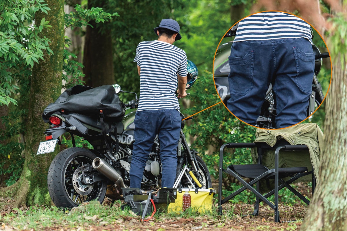•バイク用のパンツを穿いていくとキャンプやアウトドアをする際に動きにくい…