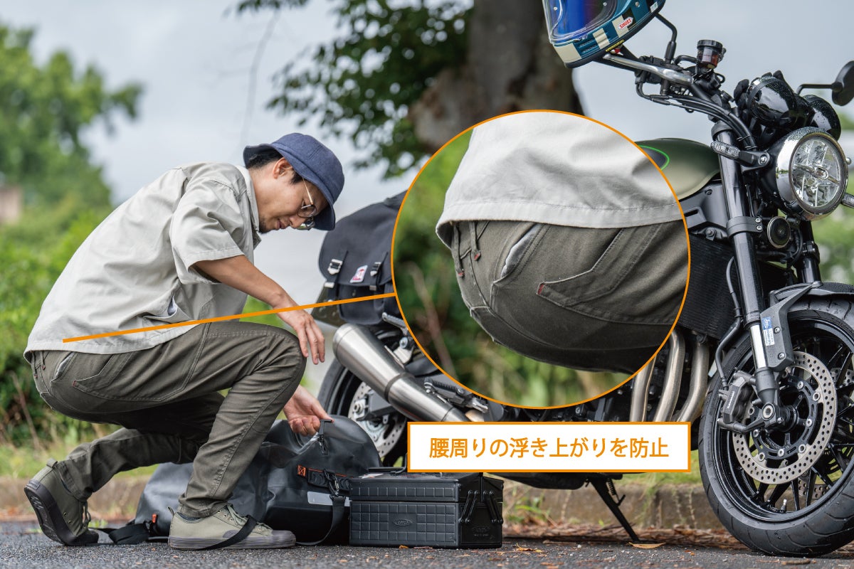 オートバイに乗って前傾姿勢になると、腰部分がどんどんずり上がってきたり、背中とパンツの間に隙間が出来て不快な思いをしたことはありませんか?