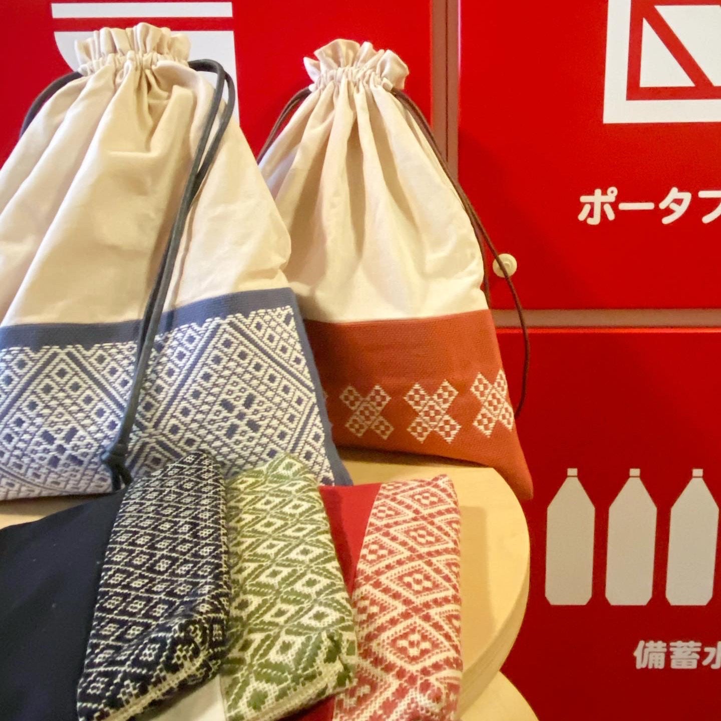 備蓄庫の中で一人分の必需品を入れたりするのに便利そうな巾着袋と、外出時の防災グッズを入れるポーチです。これらの制作は、リターン商品を作ってくださる作家のハリノヲトさんにご協力いただきました。