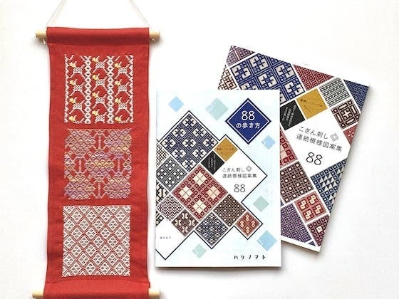 このワークショップでは、事前にハリノヲトさんが出された「こぎん刺し連続模様図案集88」と、その図案集をより楽しんでご利用いただけるように初心者にもわかりやすい図案集の解説本「88の歩き方」を製作キットのミニタペストリーと共にお送りします。