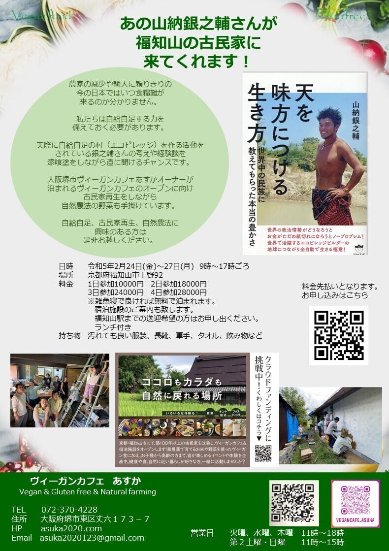 この古民家カフェ&宿泊施設では、自分で作ったお米や野菜を使ったヴィーガンメニューを提供するだけでなく、年間を通して、お子さんから高齢者の方まで、いろいろなイベントや体験を楽しんでいただける場所にしたい!と企画を計画中です。