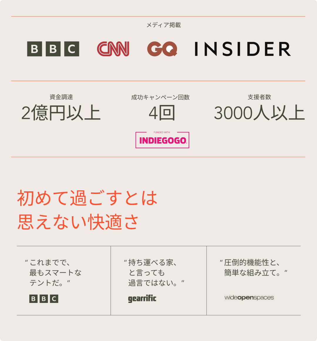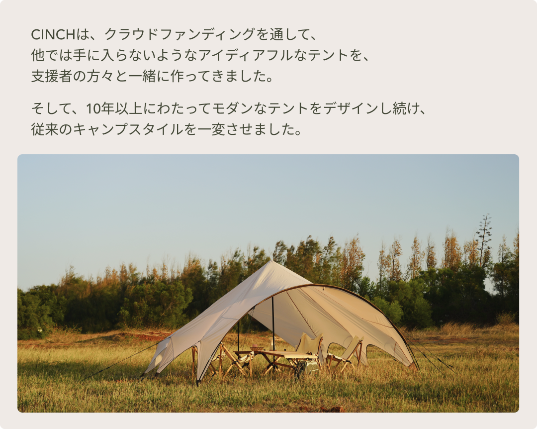 2023/09/22 16:13CINCHシリーズをご愛顧いただいている支援者様お世話になっております!CINCHチームです。Kickstarterで6000万円以上の支援を集めた、Air Cruiserが本日よりCAMPFIREに上陸しました!自動車の上に取り付けて収納も自動で収縮ができる、革新的なルーフトップテントです。混み出したキャンプ場でも、常にベストスポットを確保できる最新テントです。皆様からの熱いご支援をお待ちしております!いきなり支援は、、という方はお気軽にコメントをお寄せください。詳細はこちらからご覧ください。本日よりよろしくお願いいたします!CINCH もっと見る発送状況のお知らせ