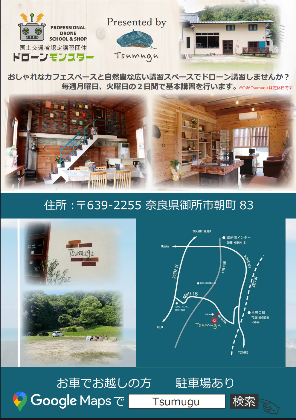 上記の活動に加え、月曜日・火曜日の2日間でドローン免許が取れる講習を実施します。ドローンモンスターとの連携により、奈良県に国家資格取得可能なドローン屋外講習場が誕生します!全国でのドローン講習場は増え続けており、近畿・大阪近郊にも多数ありますが奈良県では屋外で国家資格が取得できる講習場はまだ少ない状況です。私どものドローン講習所は、国家資格取得に必要な屋外実習場を完備しており、民間資格取得も可能です。屋内講習場も併設しており、カフェ内で座学講習ができます。また、ドローンモンスターとの連携により、最新の機器を揃え、高度な講師陣が丁寧に指導いたします。さらに、奈良県には、数々の景勝地があり、美しい風景をドローンで撮影することができます。ドローンでしか見ることのできない絶景を体感することができます。自分の技術を磨き、国家資格を取得し、美しい奈良県の景色を空から撮影することができます。また、産業用ドローンの資格も取得可能ですので、ドローンを使ったスマート農業や建築、配送など未来に向けたドローンライフを始めませんか?