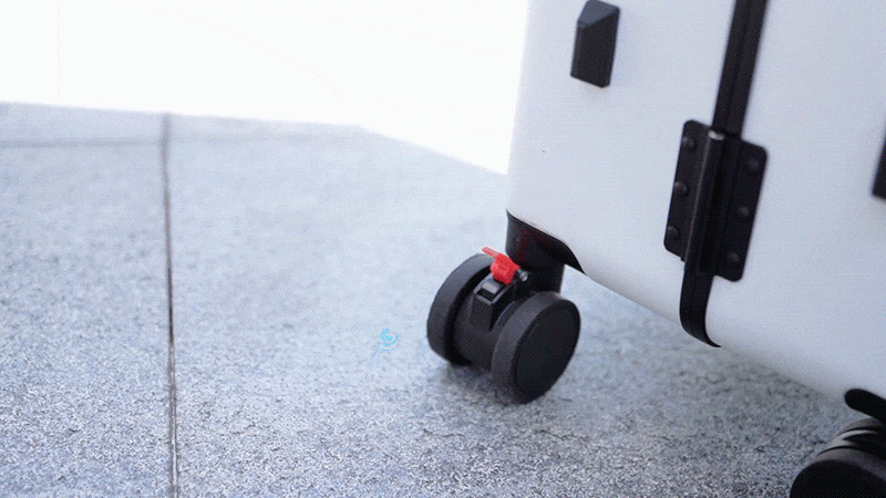 まずは、3回も進化を遂げたモーターキャスターです。最初はAI自動追尾キャリーケースと同じモーターキャスターを採用しました。しかし、そのキャスターはパワーは大きいものの重く、360度回転することができませんでした。そのため、私たちは2回目の研究開発に挑みました。それはどの方向でも固定できるワンタッチで切り替えができるというものです。ところが、電源が入っている状態でスーツケースの走行が止まると、キャスターから大きな音と振動が生じてしまいます。そこで、私たちは2回目の開発結果に基づき、センサーを追加しました。そうすることで、キャスターが止まった時に自動認識ができるようになります。アシストを停止させることもできます。こうして、電源を切った時に生じる騒音と振動問題を解決しました。それが今回のモーターセンサーキャスターです。