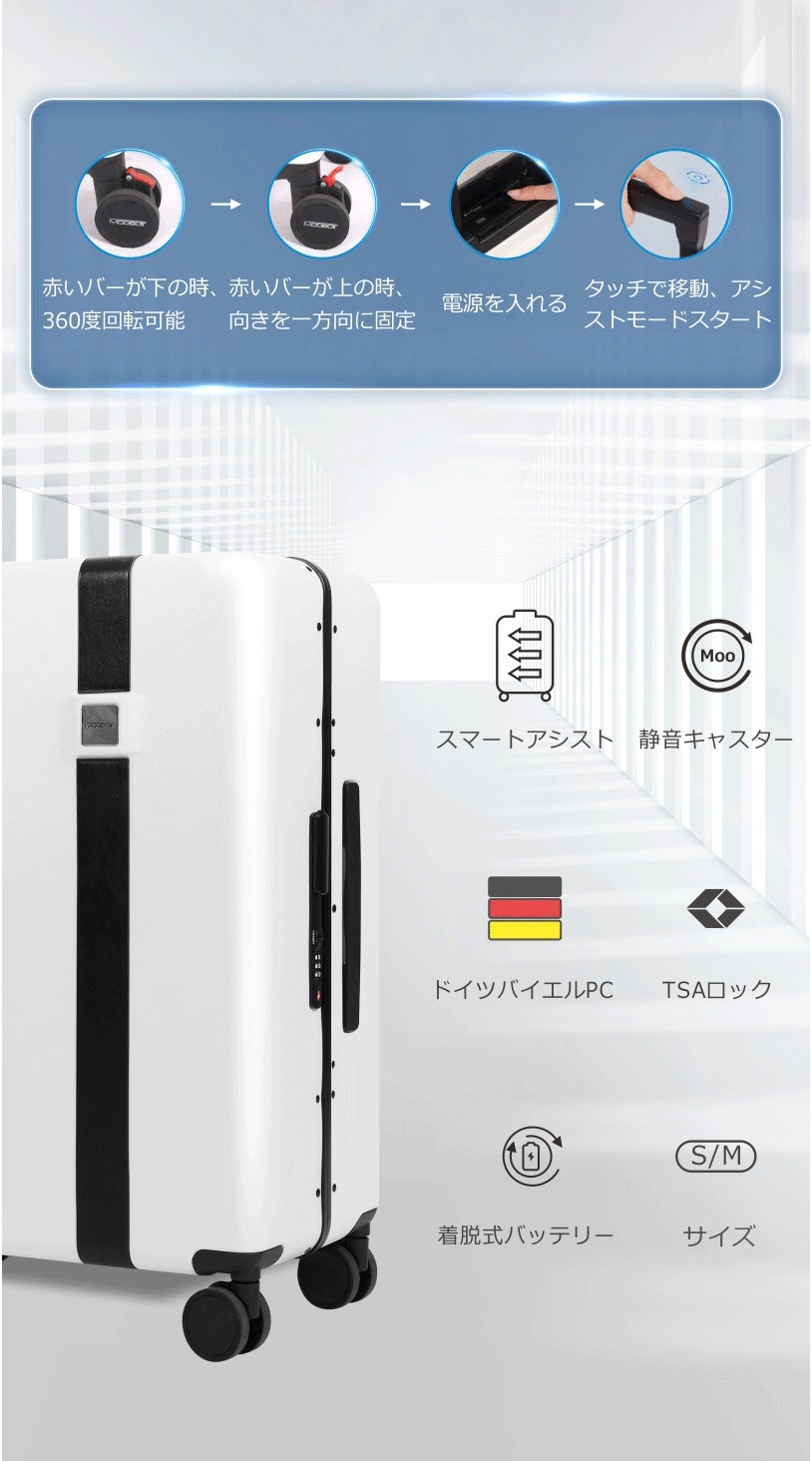 また、MOOBOTはスマートアシスト機能だけではなく、スマホの充電機能、静音キャスター、TASロックも装備しています。スーツケース本体は、ドイツのバイエル社製のポリカーボネートを使用し、丈夫さと耐衝撃性に優れています。今回2つのサイズを展開しております。Sサイズ(機内持ち込み可)とMサイズ(無料手荷物許容量)。