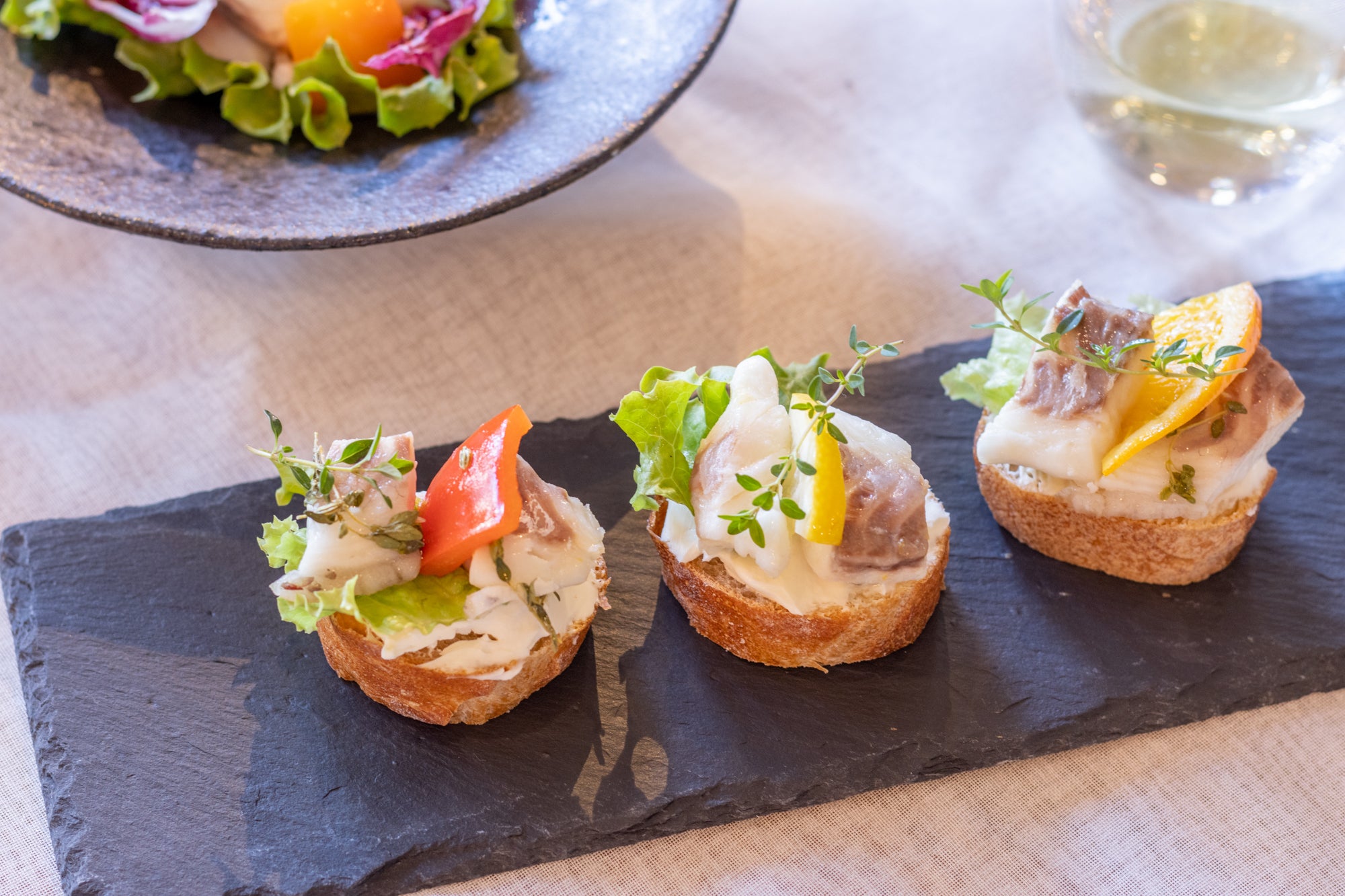 ↑バケットにクリームチーズを塗り、上からコンフィをのせたブルスケッタ。
